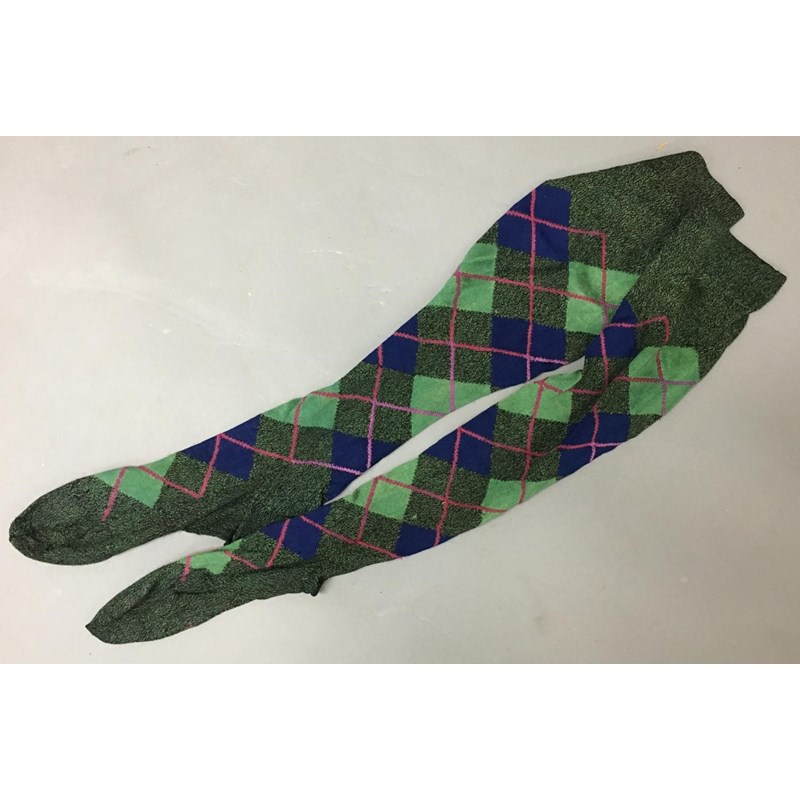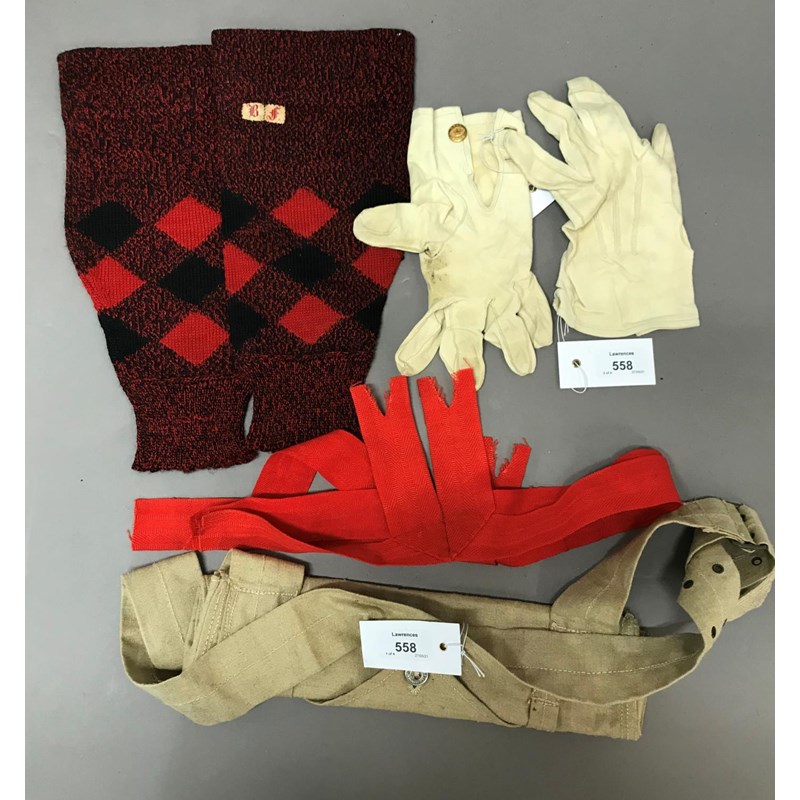 A PAIR OF ARGYLL AND SUTHERLAND HIGHLANDERS HOSE TOPPERS. A pair of woollen hose toppers, both with attached initials B F, a pair of red garters, a pair of white buck skin leather gloves stamped 'BF' each with buttons marked 'Real Buck', a canvas shoulder bag with two buttons marked 'Pullman London Simplex' and an additional pair of socks.
