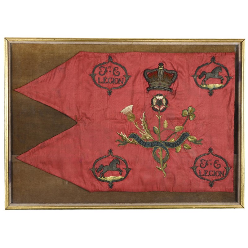 A Guidon of late 18th Century form worked with a central crowned motif representing England, Scotland and Ireland surrounded by four cartouches, two with the white horse of Hanover the others '1st E LEGION'. Inscribed to the reverse: "This Guidon was probably carried in the Peninsular War by Ensign Cawther, whose miniature portrait I remember seeing amongst my Fathers things, but witch disappeared later. My Great Grandmother Annie Waylett b.1832 was born Cawther. A Guidon was generally carried by two Ensigns, since there is only one side to this flag (and I believe it should also have a fringe) It is possible that the two Ensigns each kept half when the war was over. .. July 1992"