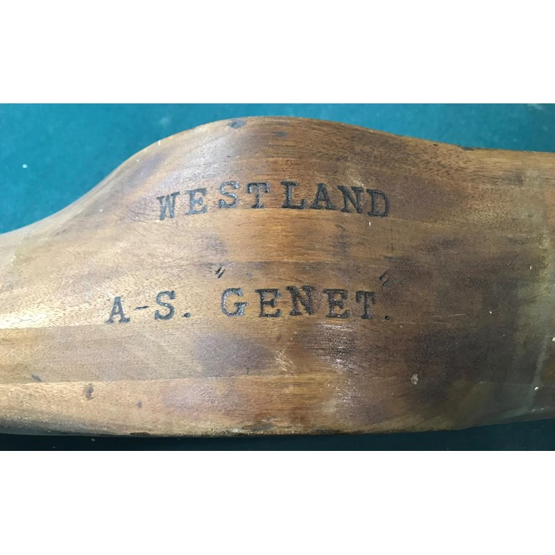 The propeller marked to the central boss 'Westland A-S Genet' and 'D 2050 P1375 ACG No 6203, June/26' the boss with six bolt holes 17cm wide, 206cm long.
