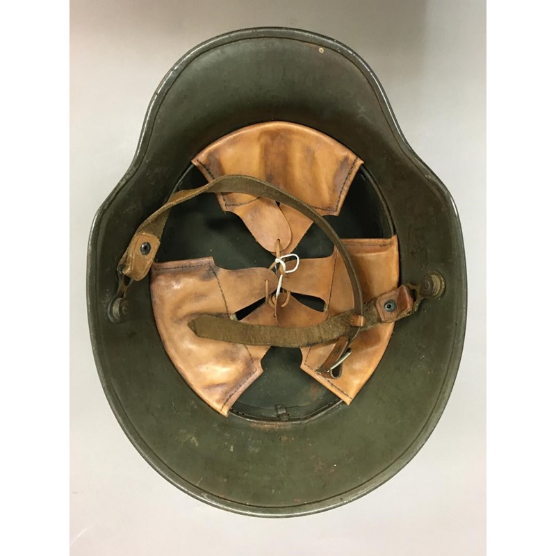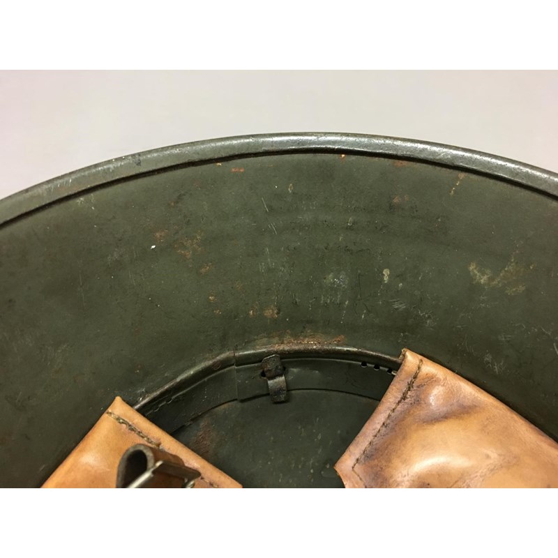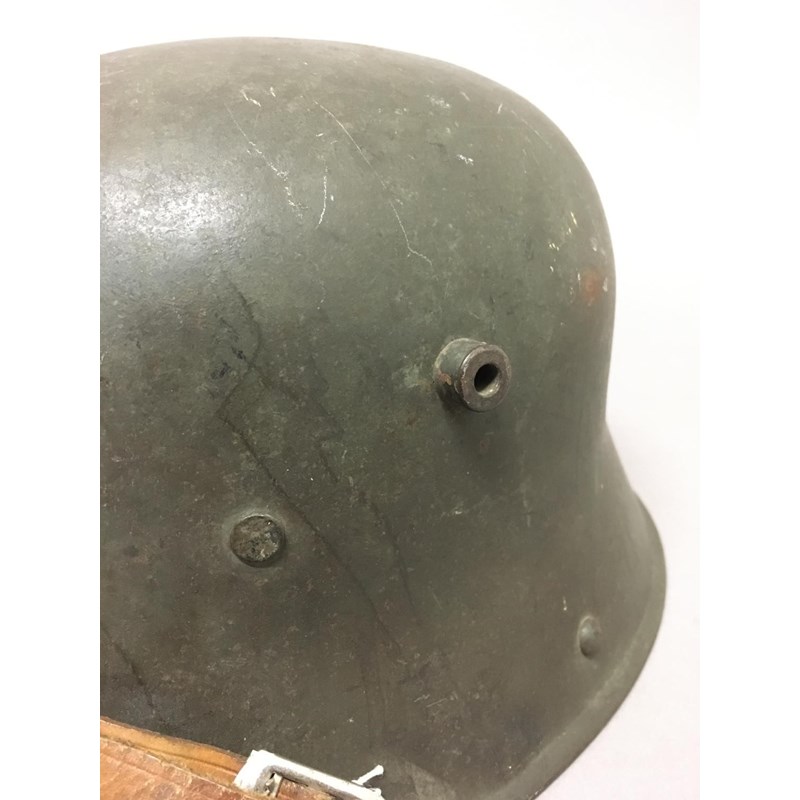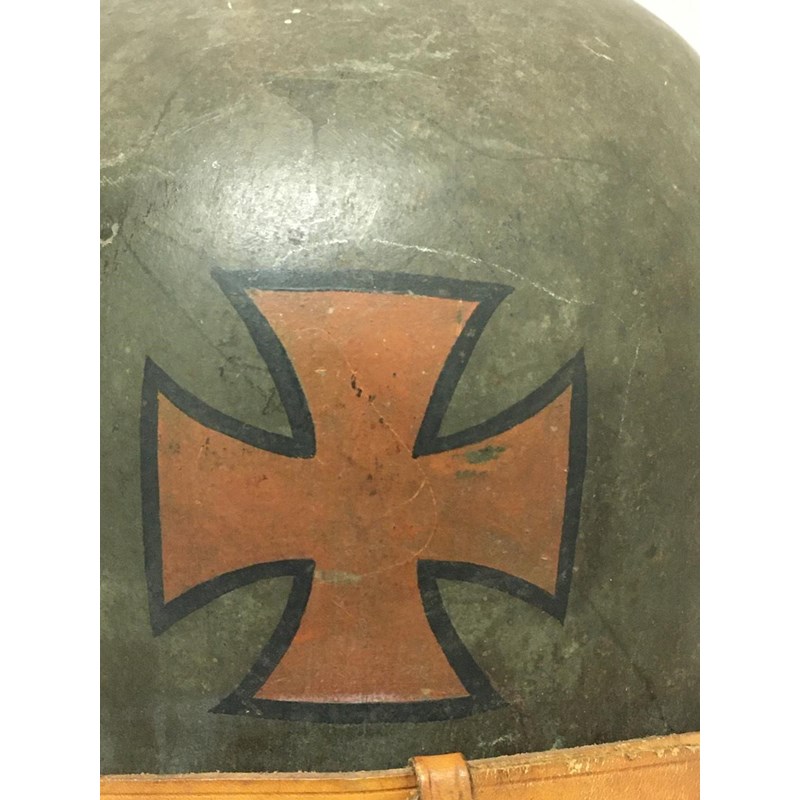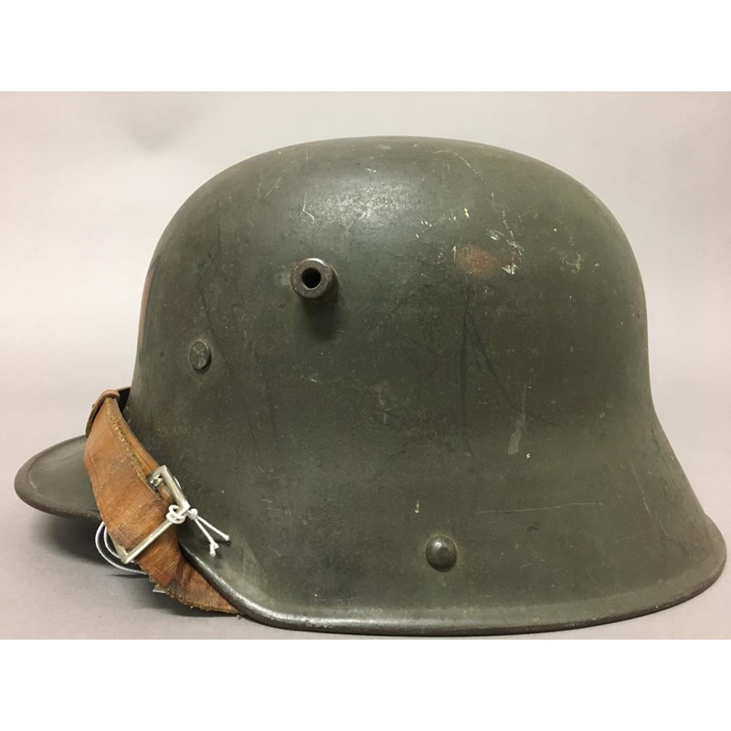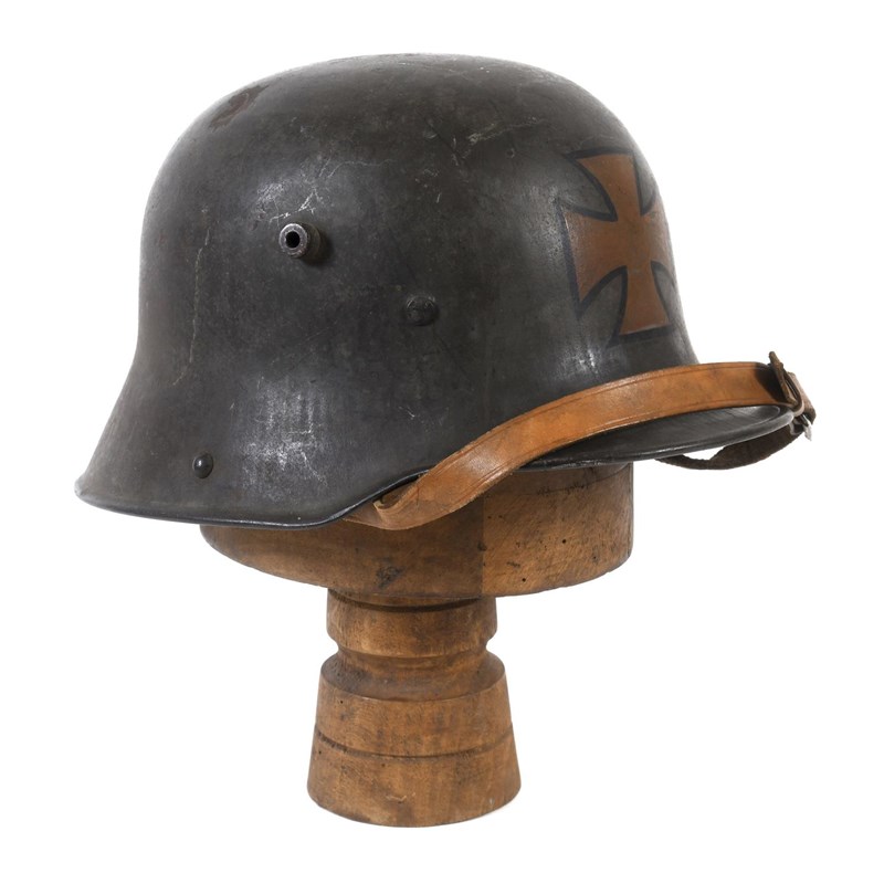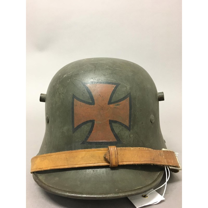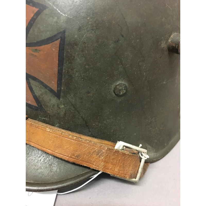 An M1918 style helmet with prominent air vents, folded rim and early type chin strap fixings, painted in the Freikorps manner with a central cross, the liner with three leather pads, stamped S1.66