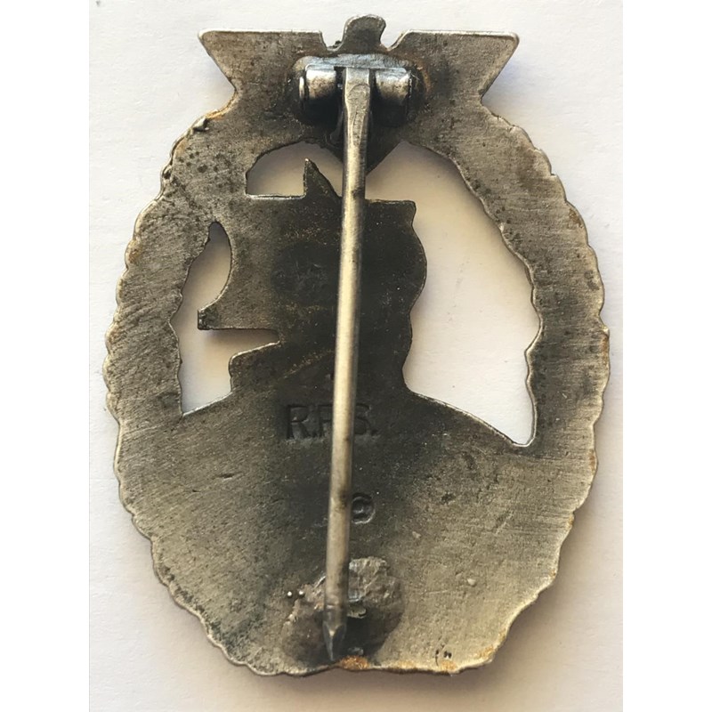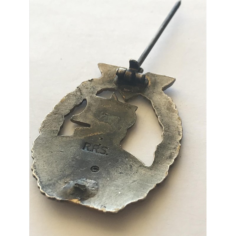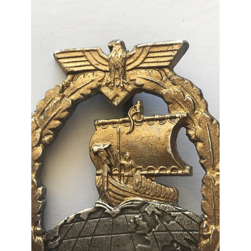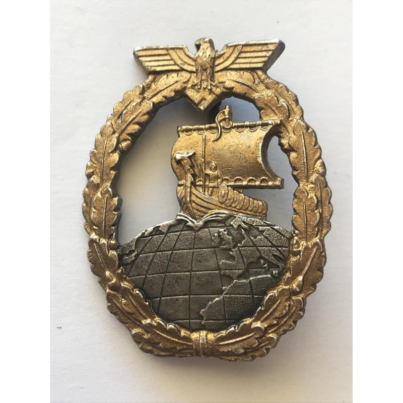 A Second World War or later Auxiliary Cruisers Badge with a Viking longboat dominating a globe within a laurel wreath and capped with a small eagle and swastika, the ship and wreath gilt, one piece construction, marked to the reverse 'R.R.S.' with round pin, 52x40 mm.