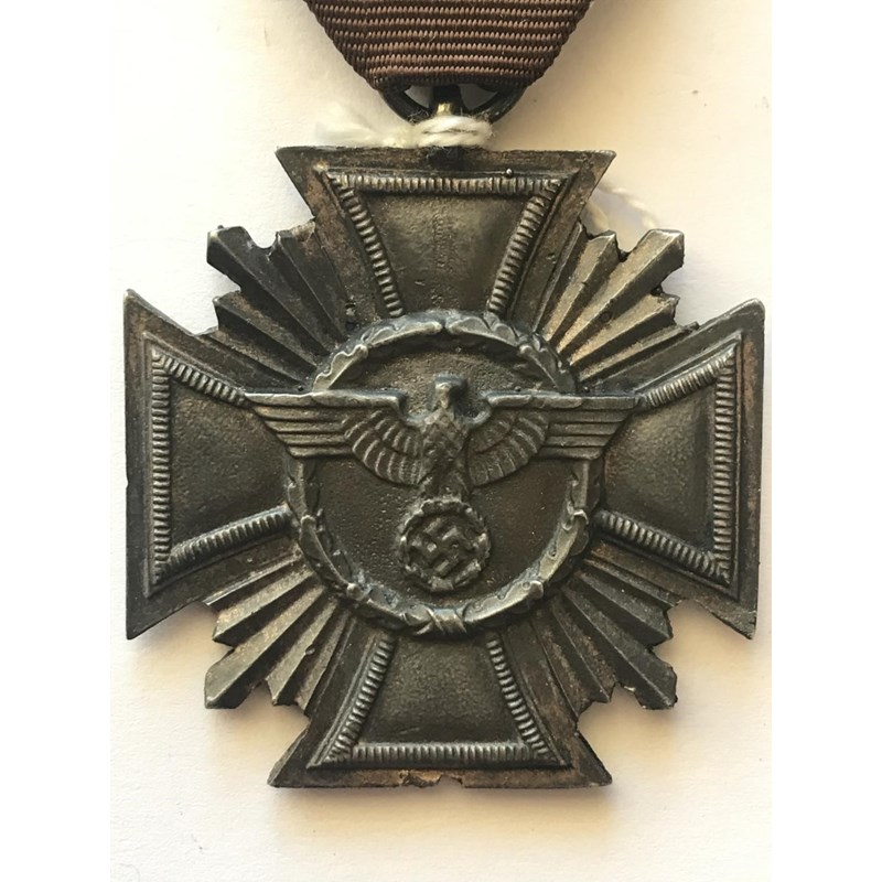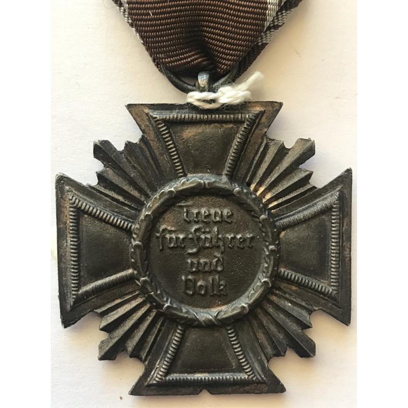 A German NSDAP Long Service Cross for ten years service, cross pattee with a central eagle with wings outstretched, the reverse with legend 'Loyalty to Leader and People', on a ring suspension and brown and white ribbon. One piece construction, 43x43mm.