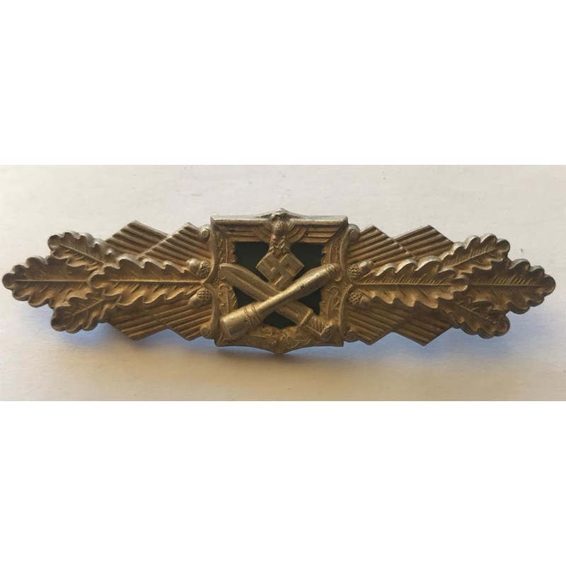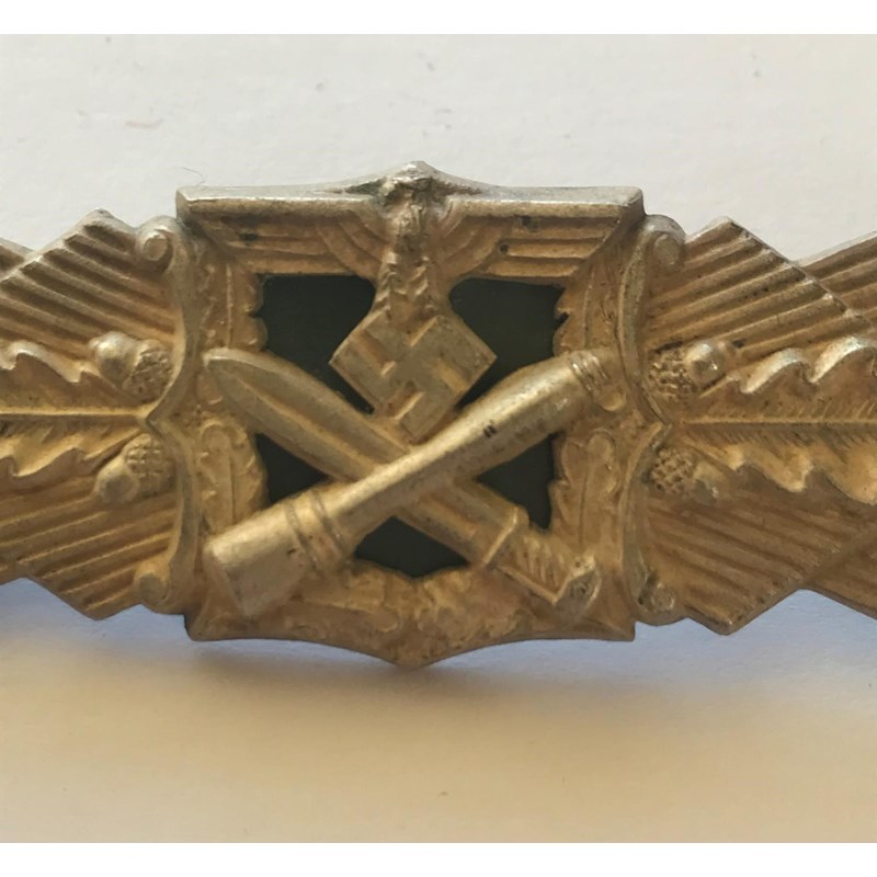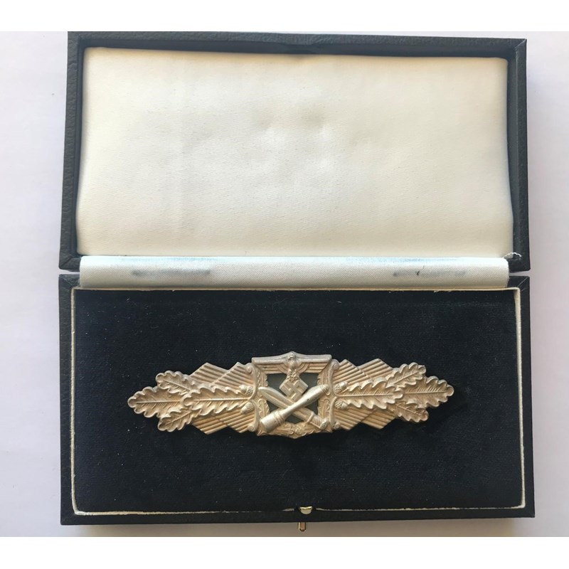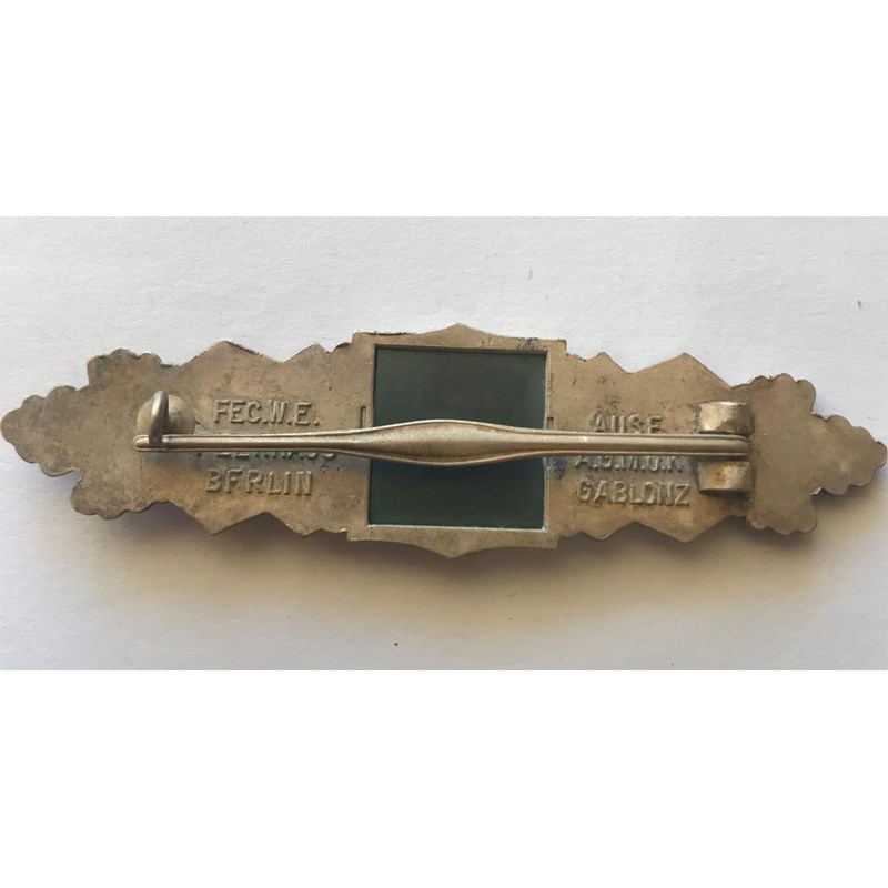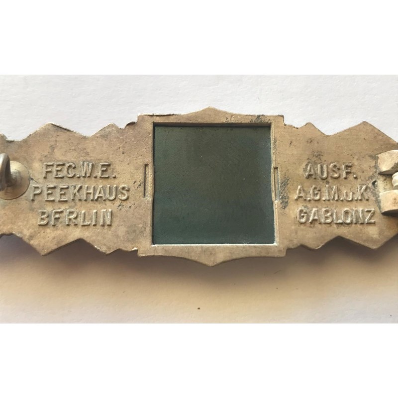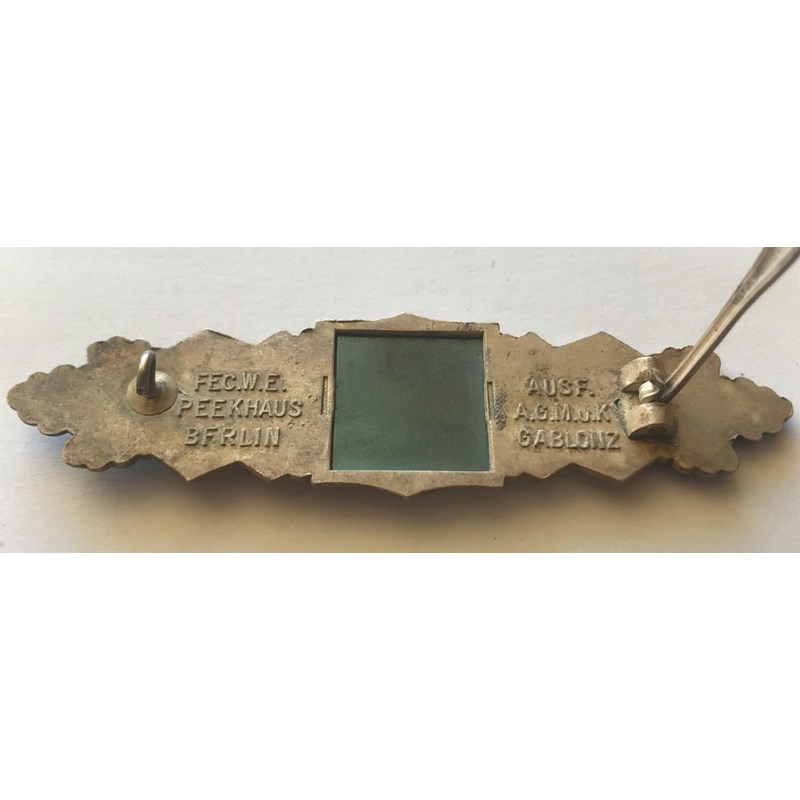 A Second World War or later Close Combat bar, silver class, with a central army eagle with swastika above a crossed bayonet and grenade against a black ground, flanked by oak leaves, marked to the reverse 'FEC W.E. PEEKHAUS BFRLIN AUSF. A.G.M.u.K. GABLONZ' with a flattened ribbed pin, 24x95 mm. In replica box.