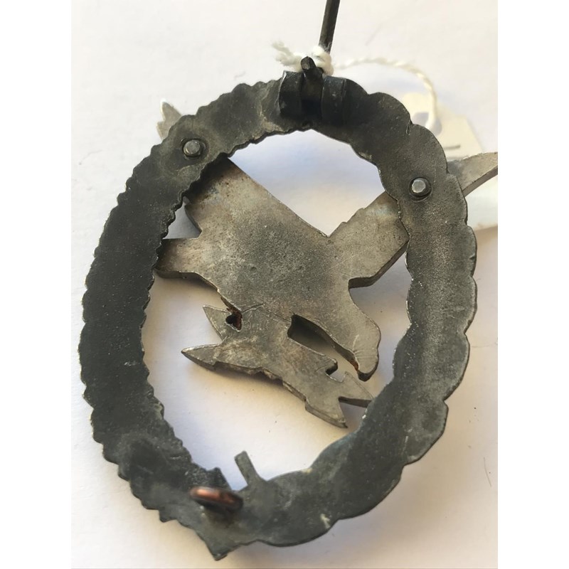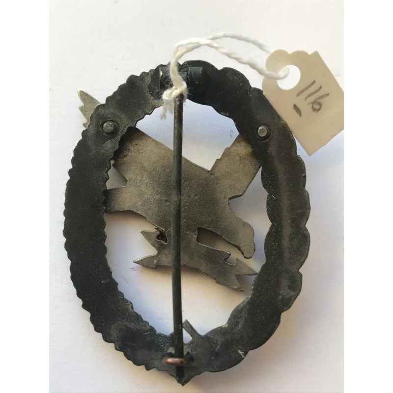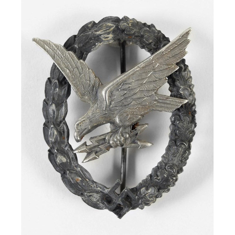 A Second World War or later German Radio Operator and Air Gunners badge with a diving eagle with lightning bolts in its claws, within a laurel and oak wreath with central swastika, twin rivet construction with round pin, 55 x 43mm. In replica case.