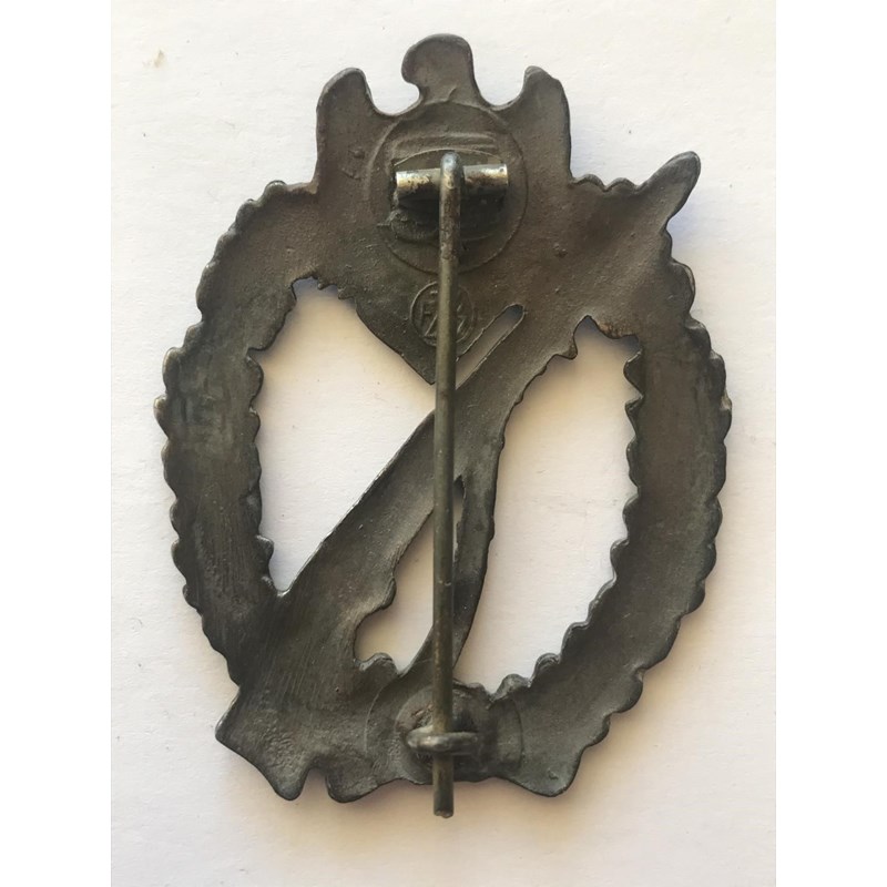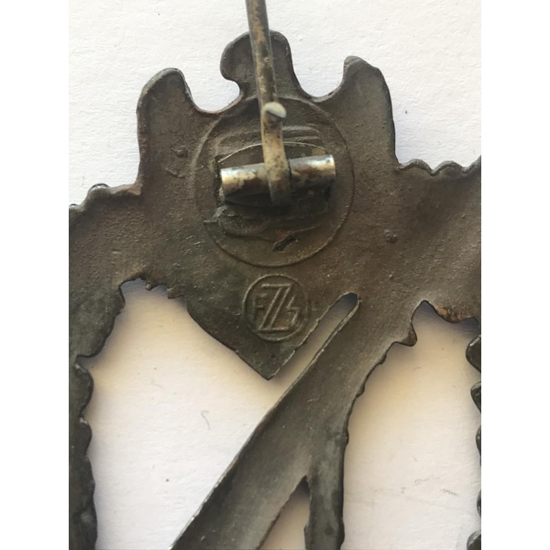 A Second World War or later German Infantry Assault badge with an army eagle above a swastika and rifle with bayonet fixed within an oak wreath, one piece construction with round pin, marked FZS in a circle, 65x48 cm, in replica cardboard box.