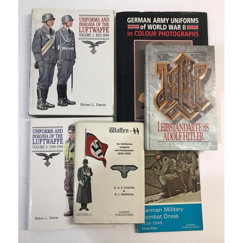 Six volumes on German Military Uniform: Uniform and insignia of the Luftwaffe' Brian Davis, volumes one and two, 'Waffen SS Uniforms and Equipment' by Fosten and Marrion, 'German Army Uniform of World War II' by Wade Krawczyk and two others. 6 volumes.