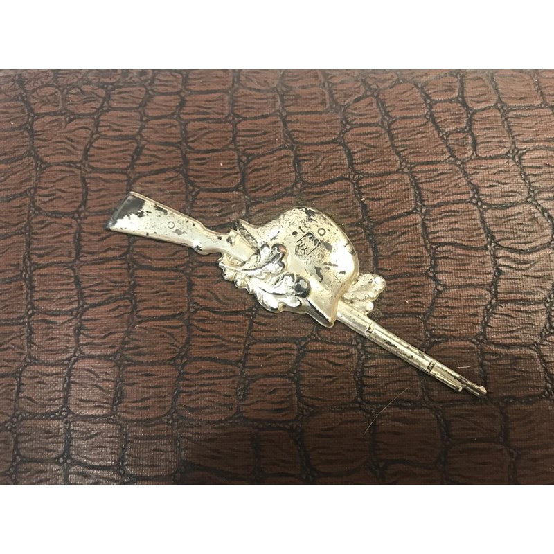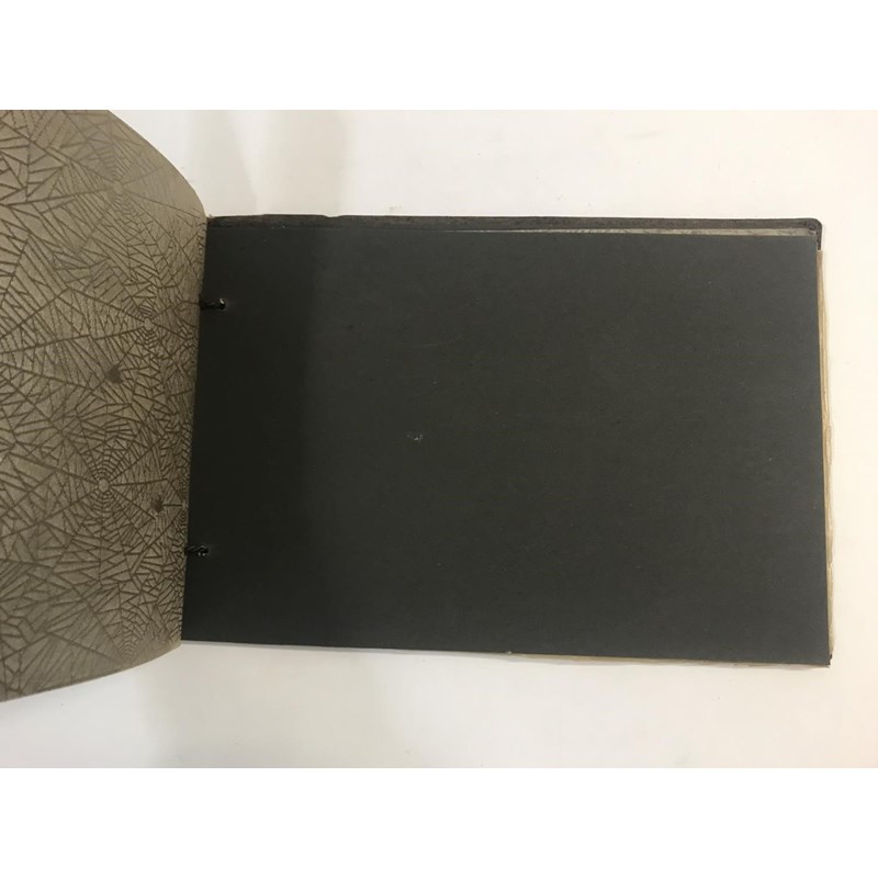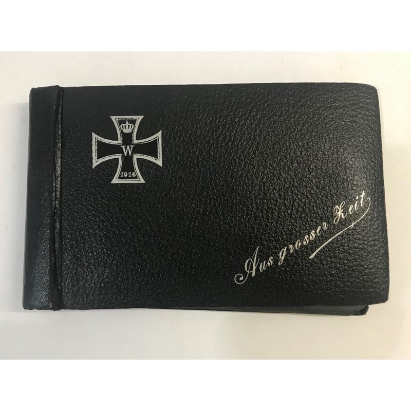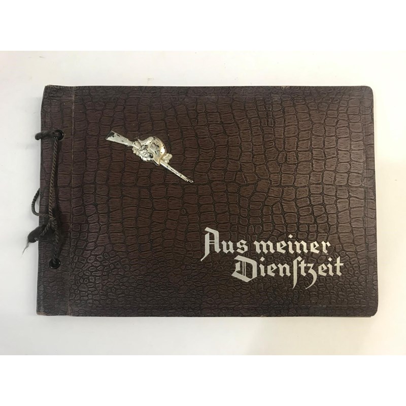 A photograph album with leather effect cover mounted with a rifle and helmet and the inscription 'Aus meiner Deinftzeit' (My time in service), 21 x 31cm and a smaller album decorated with a Great War iron Cross and 'Aus grossen Keit' (From greatness), 13 x 21cm, both lacking photographs. (2)