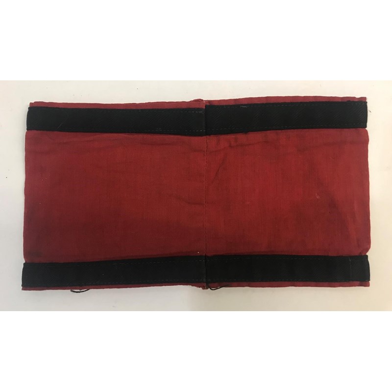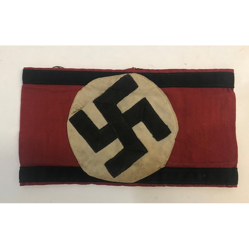 Sewn in a number of parts with a black swastika against a white roundel and red arm band with black stripes to either border, 9.5cm. This pattern of arm band suggest it is the SS-Kampfbinde introduced in 1925.