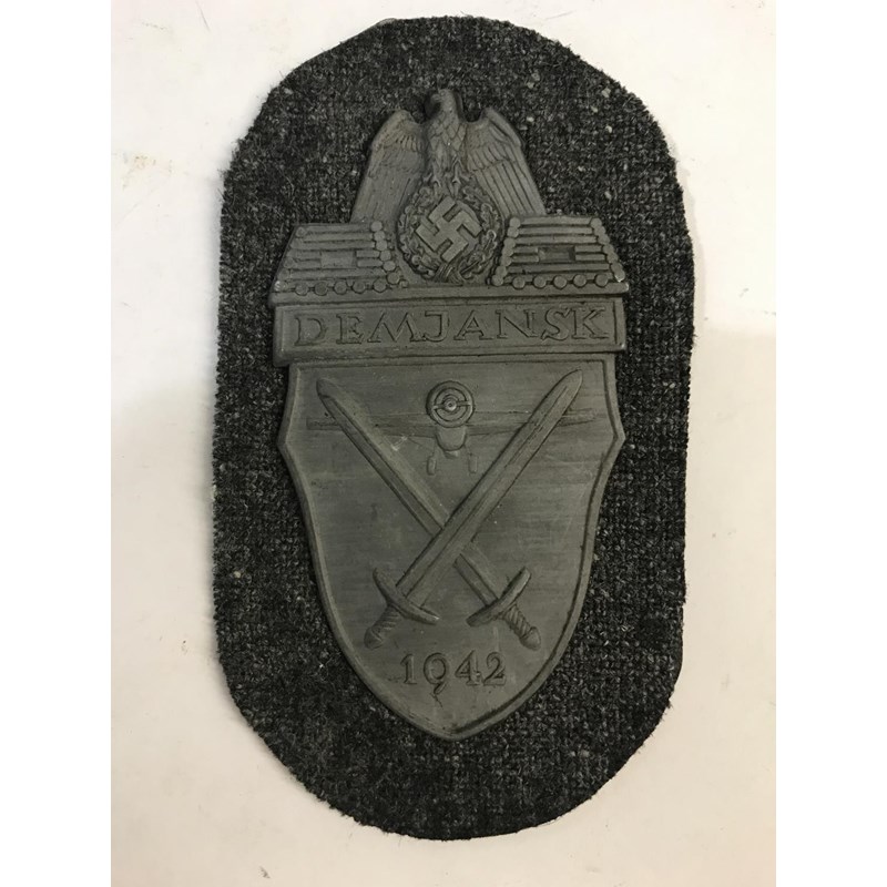 A GERMAN DEMJANSK ARM SHIELD. A 'Demjansk 1942' Arm Shield awarded to men of the 2nd Army Corps who defended the town of Demjansk 11.5 x 6.5cm. This item is Second World War or later and sold not subject to return.