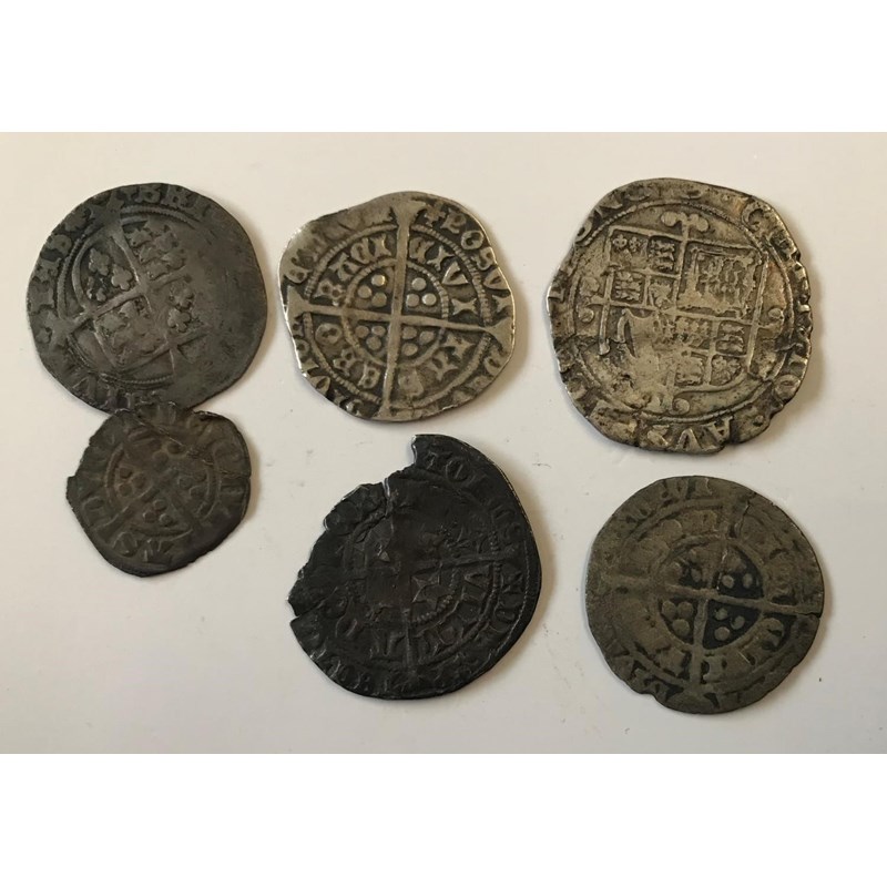 A CHARLES I SHILLING AND OTHERS. A Charles I Shilling, XII behind crowned bust and five similar hammered silver coins. 6 coins.