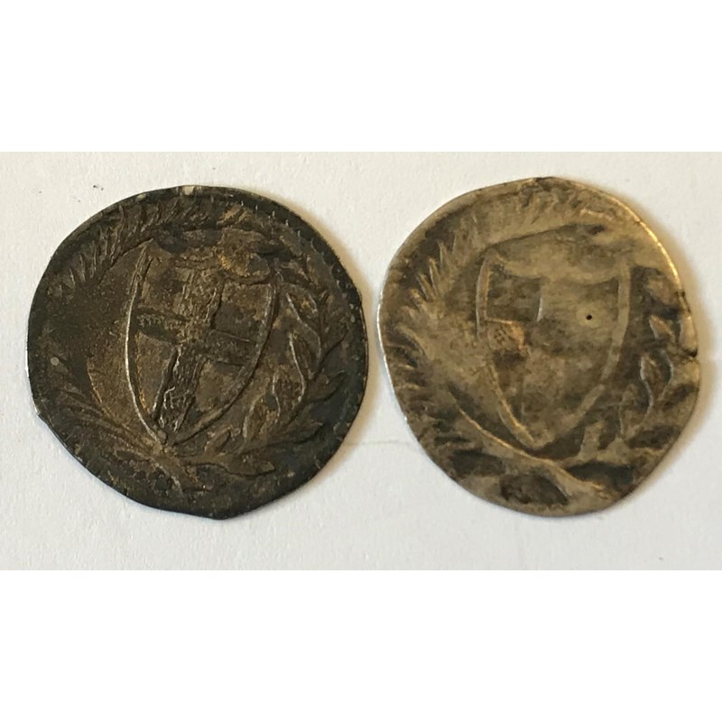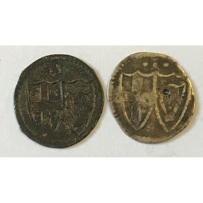 A COMMONWEALTH PERIOD PENNY. A Commonwealth Period Penny, I above shields, and another similar with tiny piercing to the centre. (2)