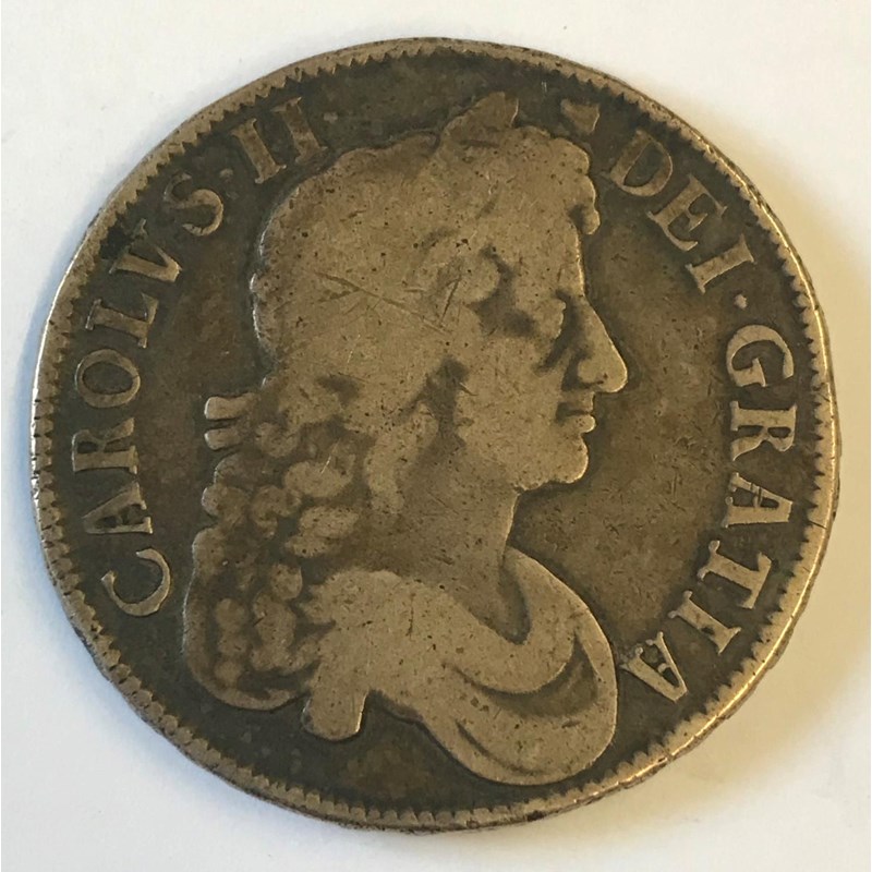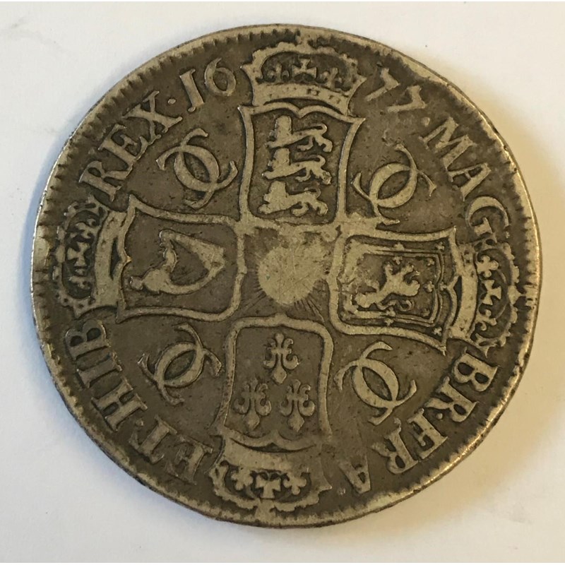 A CHARLES II CROWN. A Charles II Crown dated 1677, third draped bust, r, reverse with interlaced Cs to angles. Regnal year Vicesimo Nono to the rim.