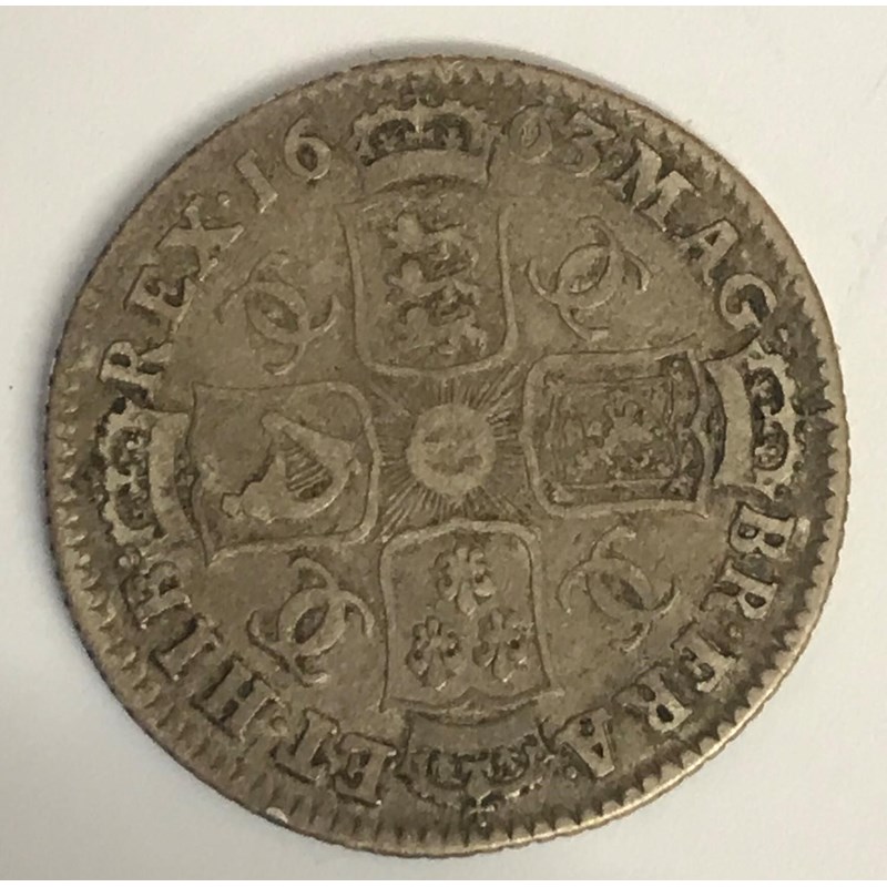 A CHARLES II SHILLING. A Charles II Shilling dated 1663, first draped bust r, reverse with crowned cruciform shields and interlinked C's in angles.