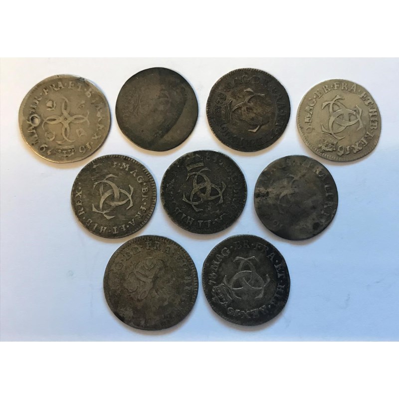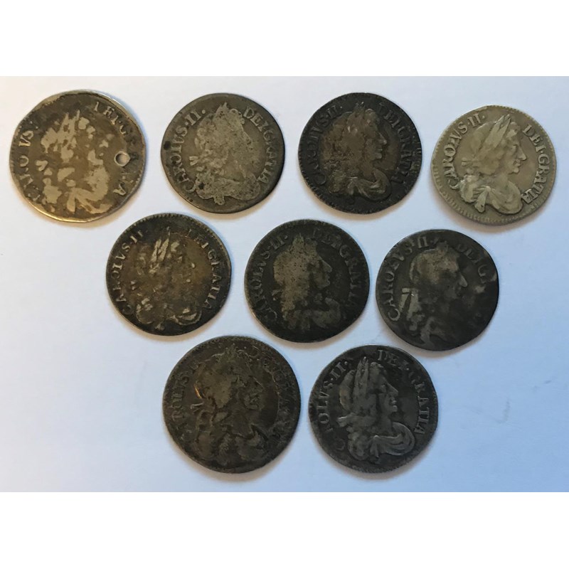 A COLLECTION OF CHARLES II 3D COINS. Charles II 3d coins for 1673, 1678, 1679 (4 one pierced), and 1684, and two further 3d coins with obscured dates. 9 coins.