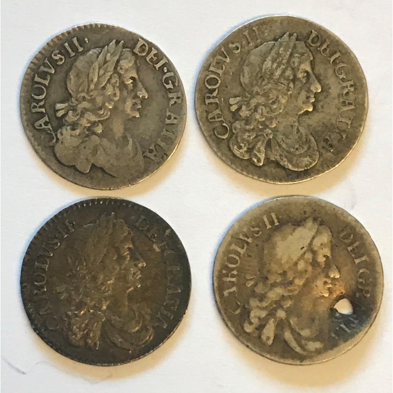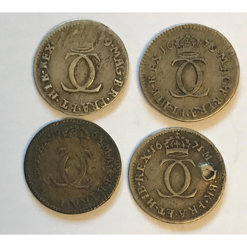 FOUR CHARLES II 2d COINS. Charles II 2d coins dated 1671 (pierced), 1679 (2) and 1668. 4 coins.