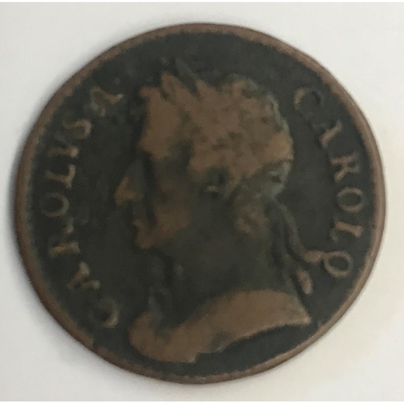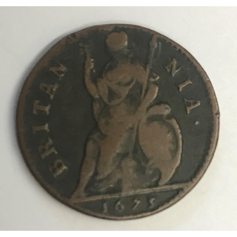 A CHARLES III FARTHING. A Charles II copper farthing, cuirassed bust left, reverse with seated figure of Britannia with date 1673 to the exurge.