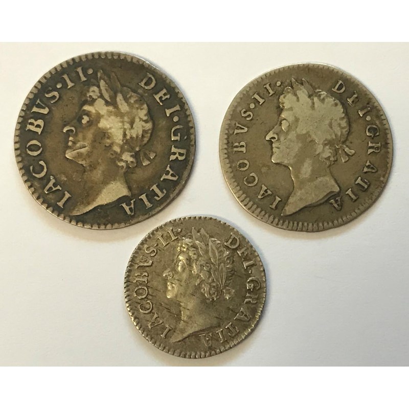 THREE JAMES II MAUNDY COINS. A James II groat dated 1686, a 3d dated 1685, and a 2d dated 1688/7. 3 coins.