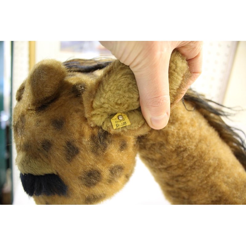 LARGE STEIFF GIRAFFE a large toy giraffe with bushy eyelashes and padded feet, with yellow Steiff Original label and button. 80cms high