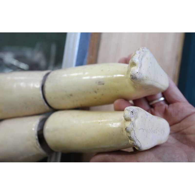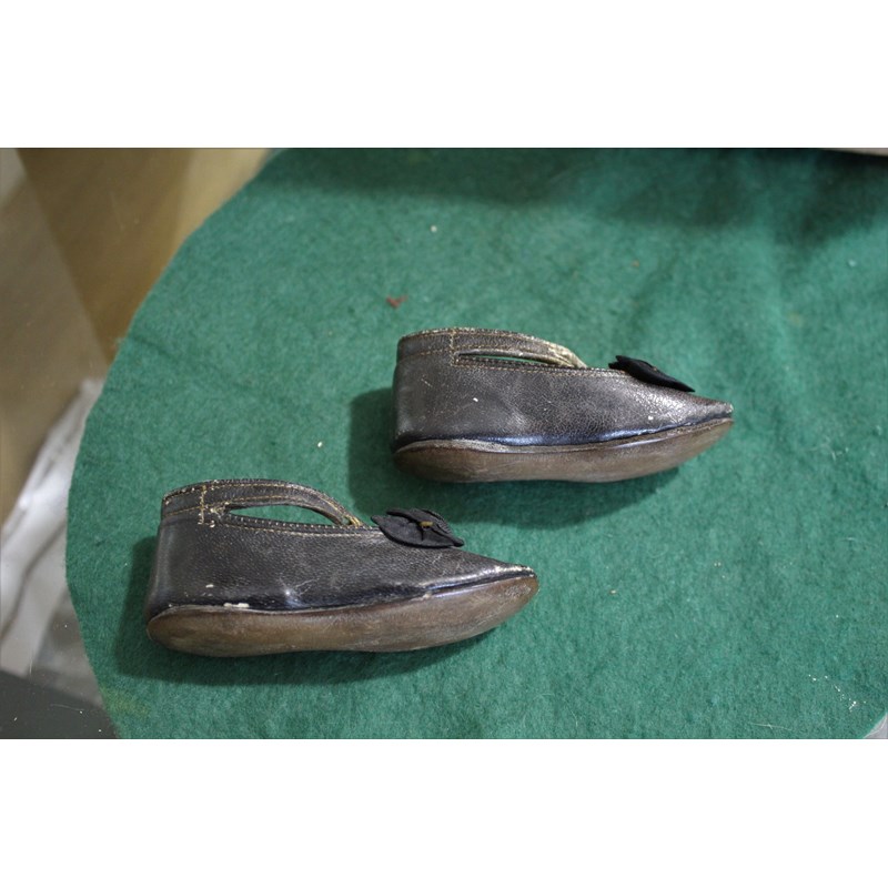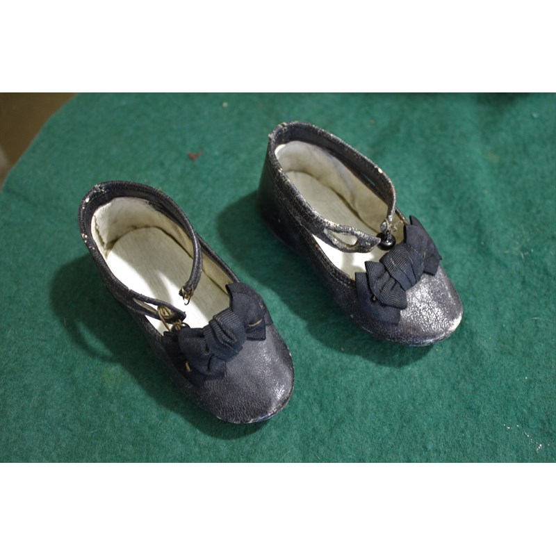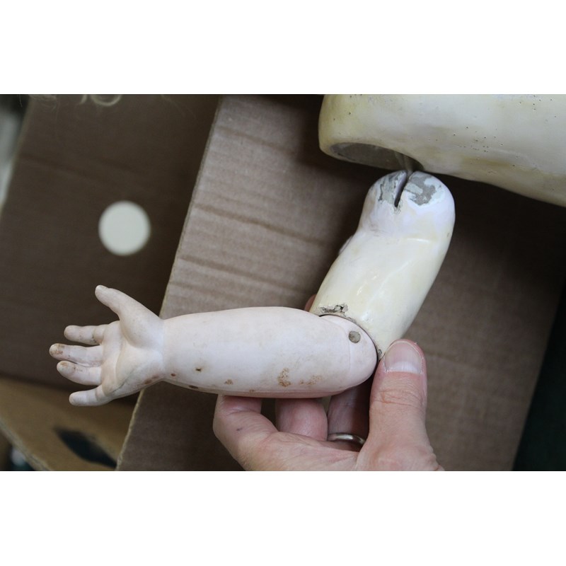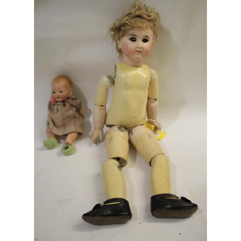 possibly Jumeau, a large doll with closed mouth and pierced applied ears, the eyes are loose inside the head and with a composition ball jointed body, and lower bisque arms. With original cork pate and vintage leather shoes. Impressed marks J 10, 24ins (61cms high). Also with a small Armand Marseille Dream Baby (351) with open mouth, 10ins (25cms) high. (2)