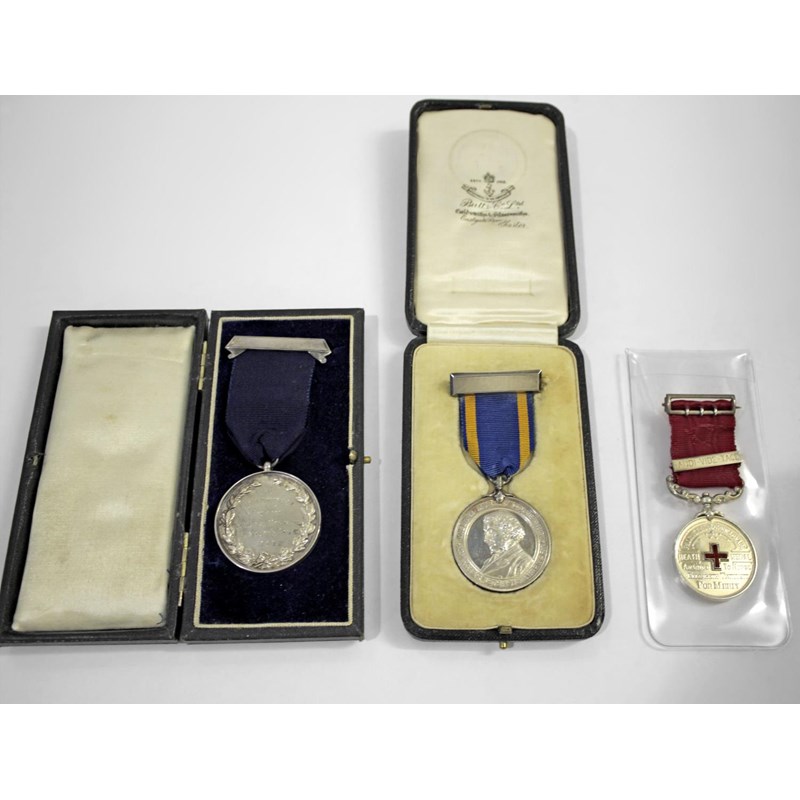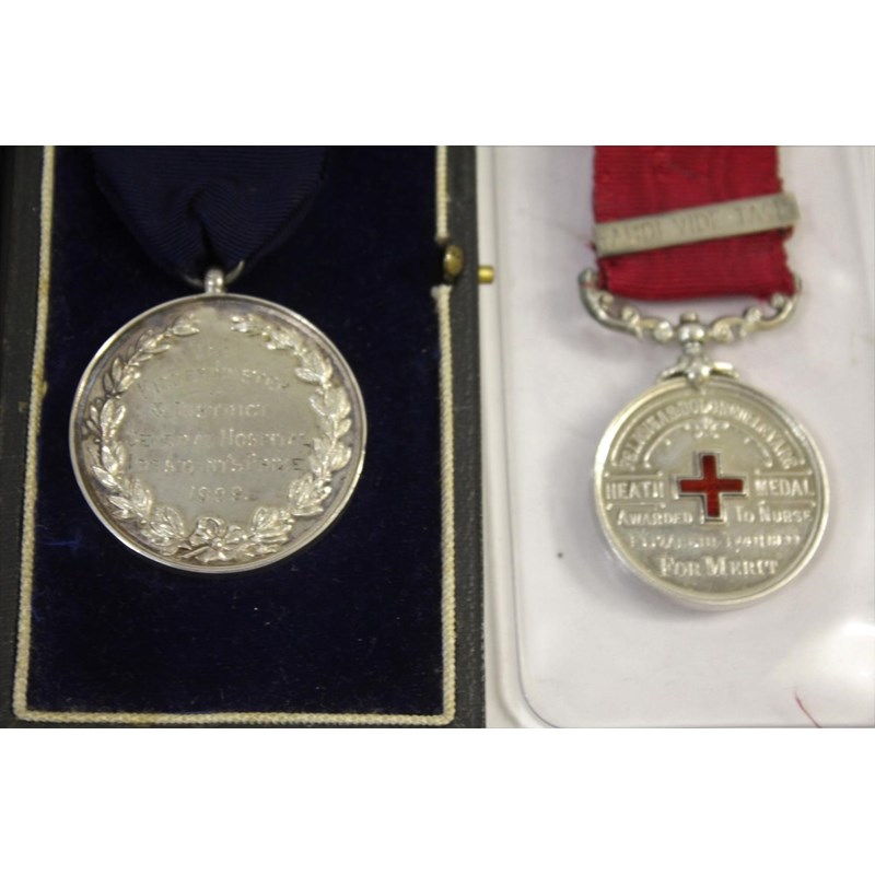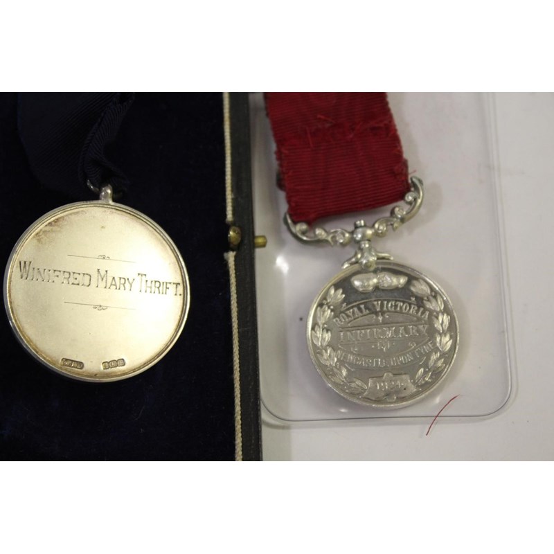 a cased silver William Murray Chester Infirmary 1875-1915 medal, Awarded by the Governors to Nurse Nellie Hughes, Theoretical 1926, in a fitted leather case with retailers name. Also with a cased silver Kidderminster & District General Hospital Presidents Prize 1929 (Winifred Mary Thrift), and a silver (unmarked) Royal Victoria Infirmary Newcastle Upon Tyne 1924, Heath Medal awarded to Nurse Elizabeth Twitchett. (3)