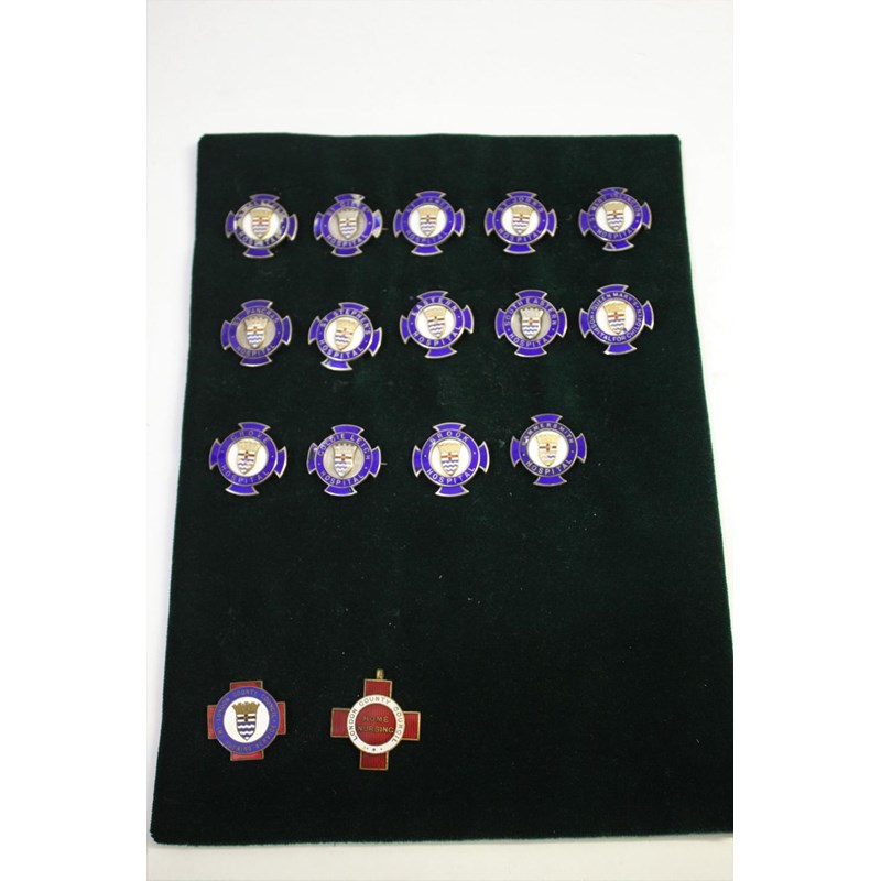 16 badges including 14 silver and enamel badges (St Aleege's, St Giles, St James, St John's, St Mary Islington, St Pancras, St Stephen's, Eastern Hospital, South Eastern Hospital, Queen Mary's Hospital for Children, Grove, Goldie Leigh, Brook, and Hammersmith). Also with two other badges, London County Council Nursing Service and Home Nursing.
