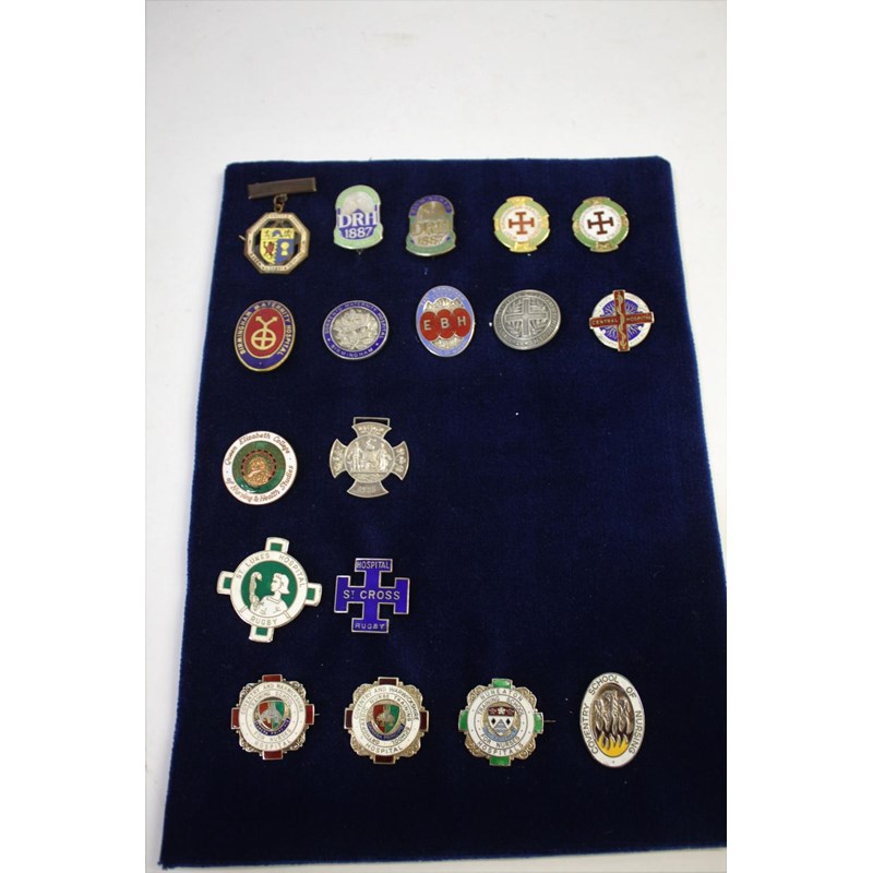 18 various badges including Birmingham United Hospital, Birmingham DRH (silver), West Birmingham Health District, Birmingham Maternity, Sorrento Maternity Hospital Birmingham (silver), The Royal Orthopaedic Hospital Birmingham (silver), Central Hospital (silver), Queen Elizabeth Collage, Birmingham Asylum Committee (silver), St Lukes Rugby (silver), St Cross Rugby (silver), Coventry and Warwickshire (x2 silver), Nuneaton Training School (silver), Coventry School of Nursing (silver).