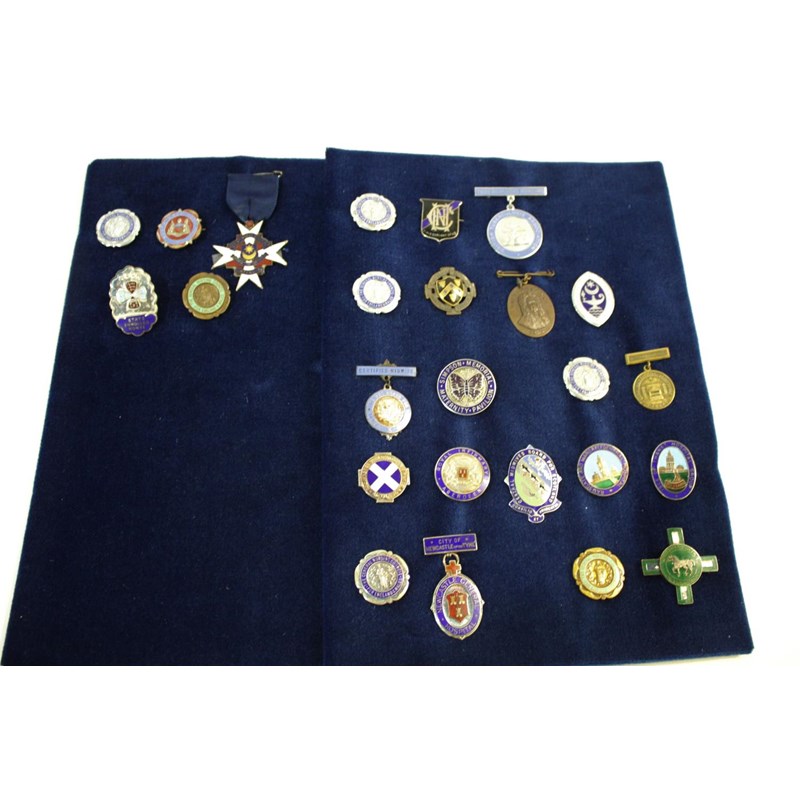 25 various badges on two cards, including a silver and enamel badge (Finis Coronat Opus), Tuberculosis Nursing, Guys Hospital, St James Portsmouth, Simpson Memorial Maternity, Royal Infirmary Aberdeen (silver), Sick Children' Nurse Scotland (silver), Margate General, Thanet (silver), Mid Wiltshire, Booth Hall, etc.