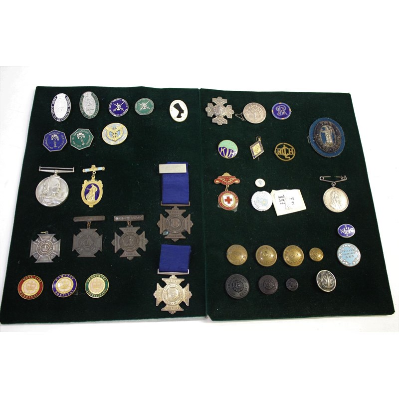 2 cards with various badges including Army School of Psychiatric Nursing, Army Medical Services, Royal Air Force Training School, Orthopaedic Nursing, Long and Efficient Service Medal (Miss Marjorie Lees), Nursing Association (silver), Proficiency medals (1 in silver), Moss Side, Rampton, Broadmoor, Guys Hospital, Asylum Badges (Horton, Long Grove and Hanwell), Cheltenham General etc.