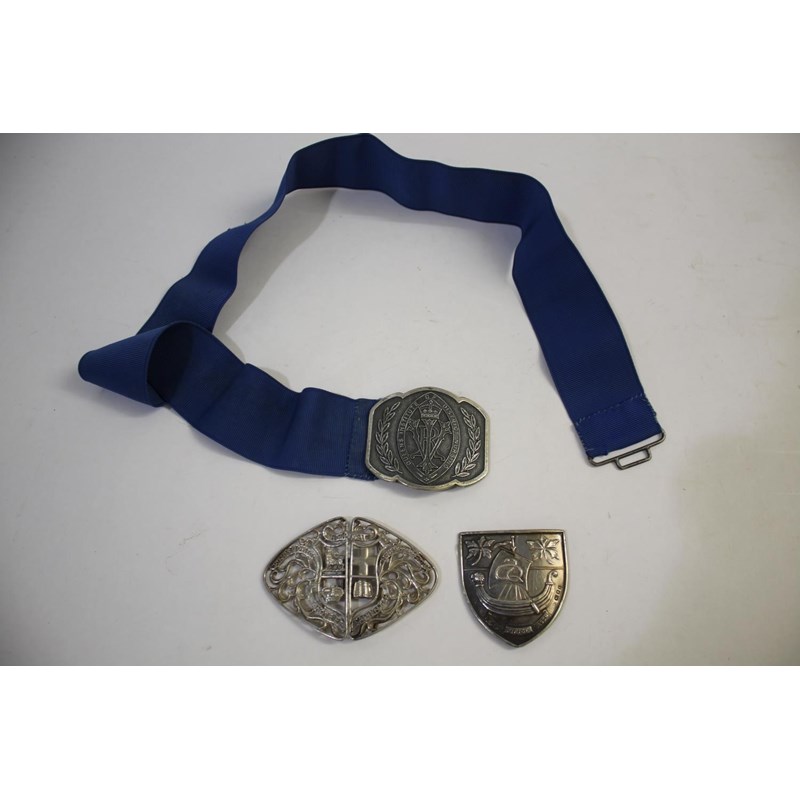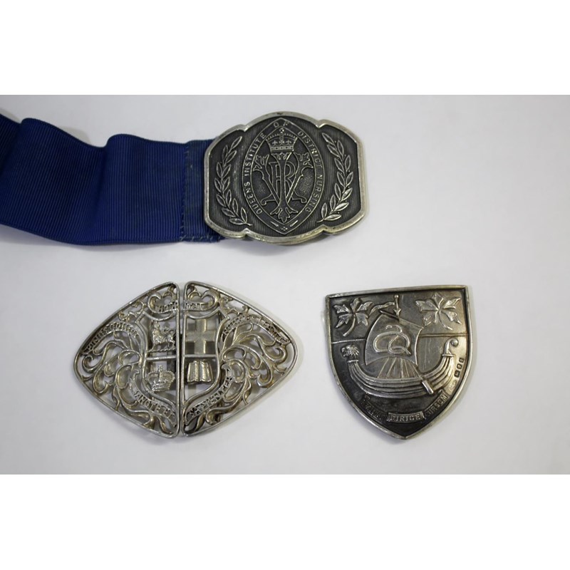 a shield shaped buckle with latin motto Ratione Dirice Cursom (University College Hospital), marked for London 1874. Also with a buckle for the Queen's Institute, and a silver buckle for Kings College Hospital Nurses League (Birmingham). (3)