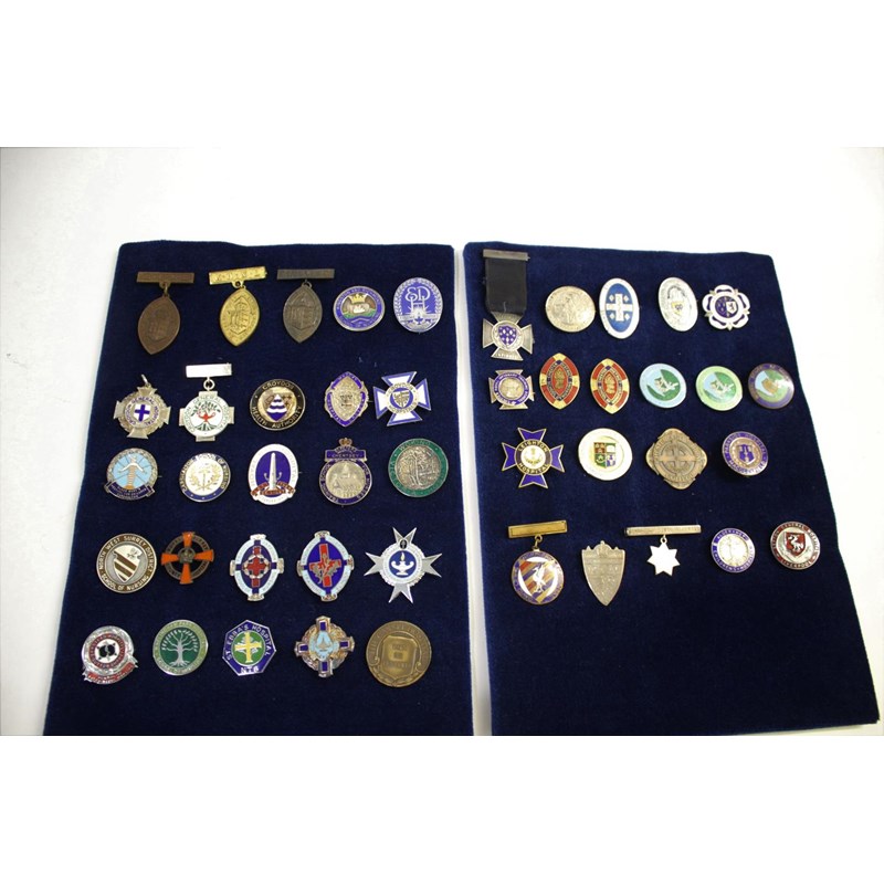 2 cards with a variety of badges including Stockport Infirmary (silver), Thomas Hospital Stockport (silver), Stepping Hill Stockport, Macclesfield Hospital, Chester Royal Infirmary Training School (silver), Chester District, Wirral School of Nursing, Royal Southern Liverpool (silver), Alder Hey (silver), Kingston Hospital, Croydon General (silver and others), Royal Eye Hospital, Woking Victoria Hospital (silver), Royal Surrey, Chertsey, and many more.