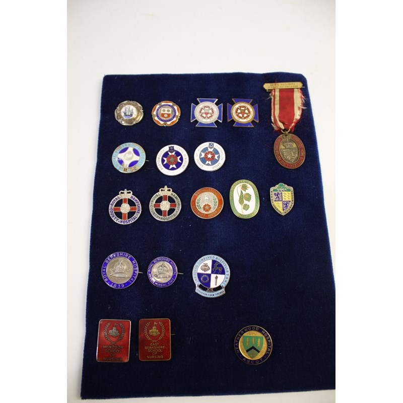 19 various badges including South Hants and Southampton (silver), The Borough Southampton (silver), Southampton University Hospital, Queen Alexandria League of Children, Portsmouth Hospital, Royal Hampshire (1 silver), Basingstoke Hospital (silver), RV & WH Portsmouth (silver), Berkshire Hospital and Private Nursing Staff (both silver), Windsor School of Nursing, Reading Combined Hospital etc.