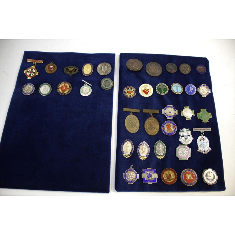 2 cards with various badges including Manchester Royal Infirmary (x2), Withington Hospital Manchester (x2), Ancoats Hospital Manchester (silver), Salford Hope Hospital (x3, 1 silver), Park Hospital Manchester (silver), Blackpool School of Nursing (x3), Bury Infirmary (silver), North Middlesex (x2, 1 silver), Isleworth Nurses League, Redhill County Hospital (silver), Ashford Hospital, Bridgwater Hospital (silver) etc.
