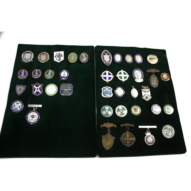 2 cards of various badges including Western Infirmary Glasgow (silver), Glasgow Royal Infirmary (x3, silver), Victoria Infirmary Glasgow (silver), Queen Mothers (silver), Edinburgh for Sick Children (silver), Royal Infirmary Edinburgh (silver), Stirling Royal, Lanarkshire College (x2, silver), Kirkcaldy Fife (silver), Dundee Royal, Monklands, Royal Scottish (silver), Ayr Hospital (silver), Scottish Borders (x3, silver), Aberdeen Hospital (silver), Grays Elgin, Perth Royal Infirmary, etc.