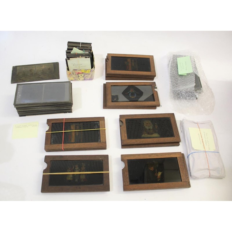 a qty of wooden framed slides including some with moveable glass slides, Feed the Horse, Mutton Pies, School Master, figures skipping, Christmas Pudding, Horses in the Pound, Man with hat on fire etc. Also with glass slides including flowers, birds eggs, trees, China, India etc (most annotated).