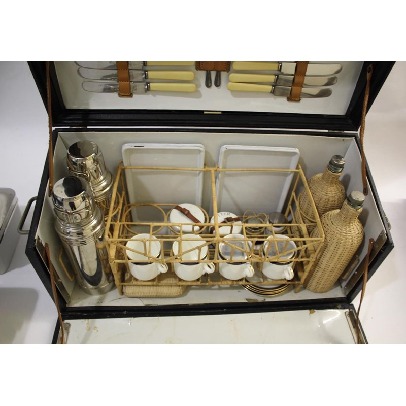an En Route vintage picnic set, with a fall front and containing two large pottery and silver plated containers, thermos containers, lidded bottles, tea cups and saucers, enamel trays, pottery jars etc. The inside of the lid with cutlery and an ivorine plaque for Drew & Sons, Piccadilly. Case 57cms across, 30cms high
