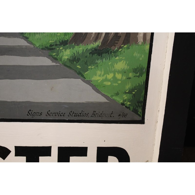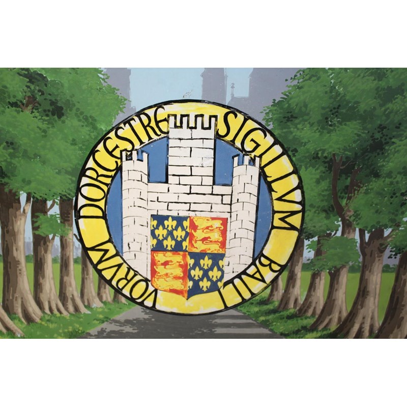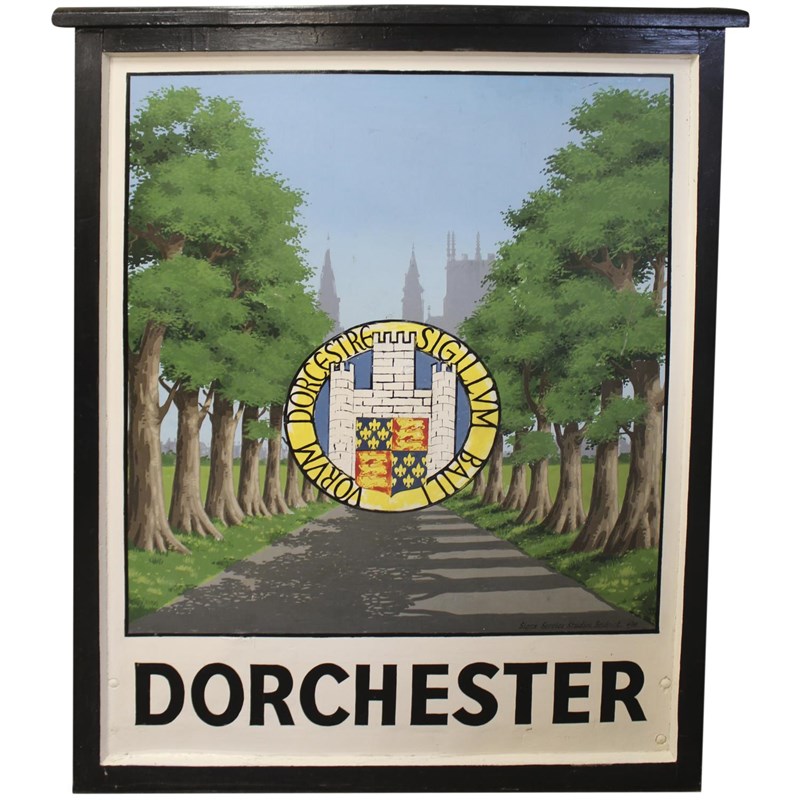 a large hand painted wooden sign by the Bridport Sign Service Studios, with a depiction of Dorchester's famous avenue of trees, Dorchester Coat of Arms and silhouette of the town buildings. Marked, 4/66 for 1966.