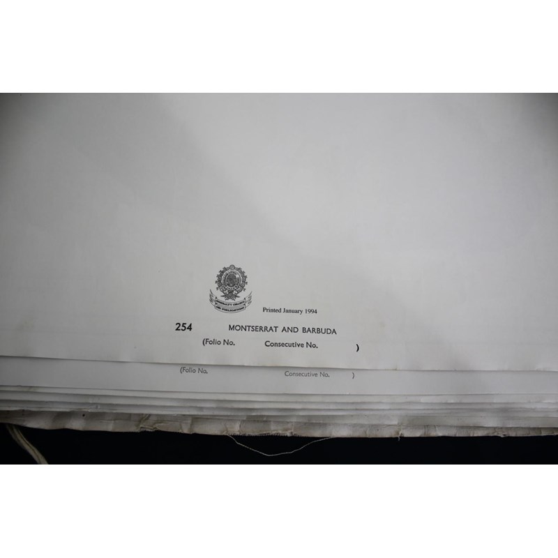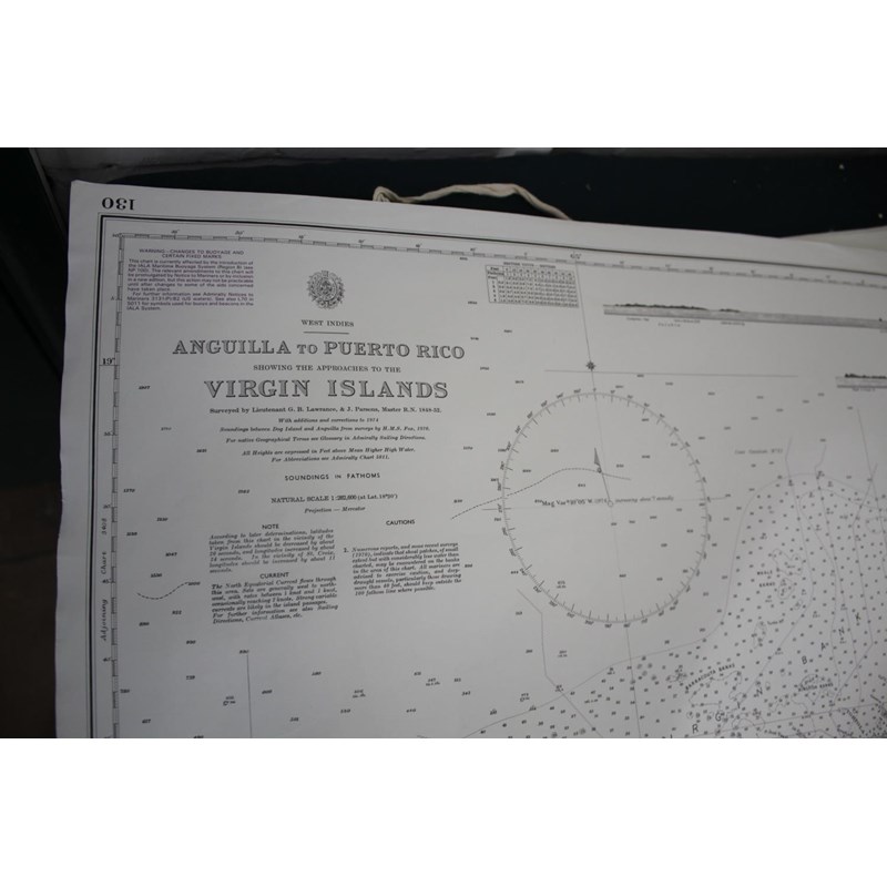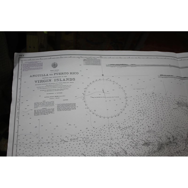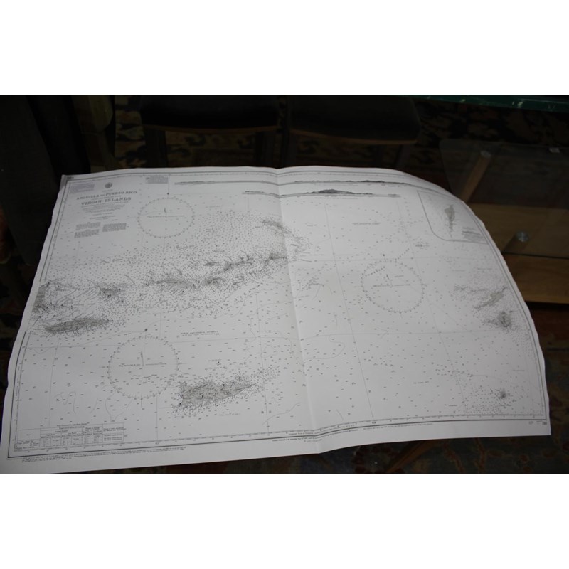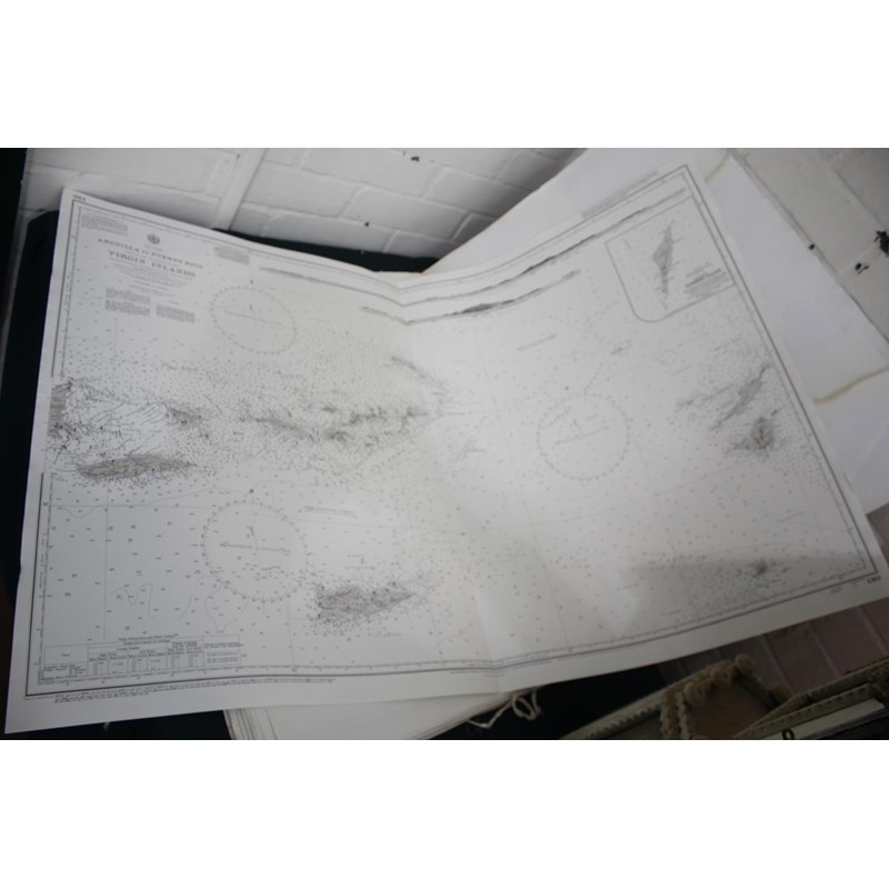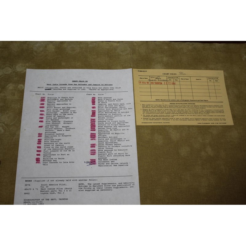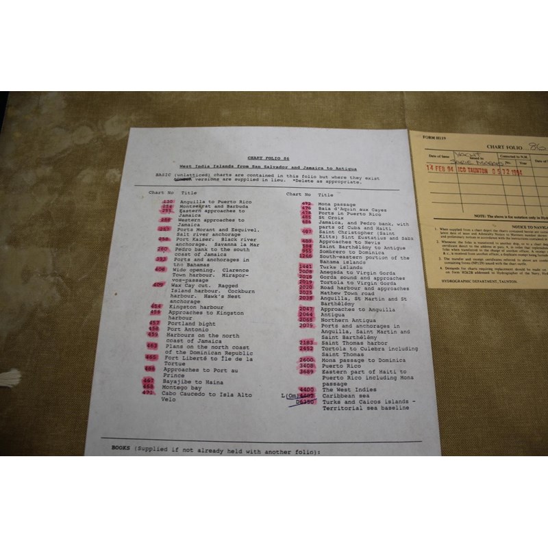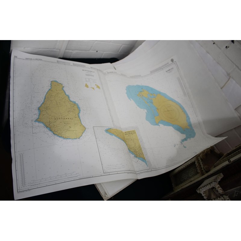 a collection of 48 naval sea charts, from around the West Indies region and including Jamaica, Dominican Republic, Antigua, Puerto Rico, Turks Islands, Bahamas, and many more. In a folder from the Taunton Hydrographic Office, 1994.