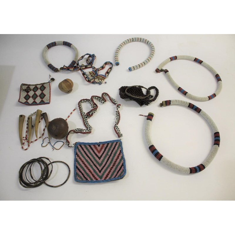 ZULU BEADWORK TRIBAL ITEMS a mixed group including various beadwork neck rings, beadwork bag, beadwork choker, necklace with teeth ornaments, metal bangles and other items.