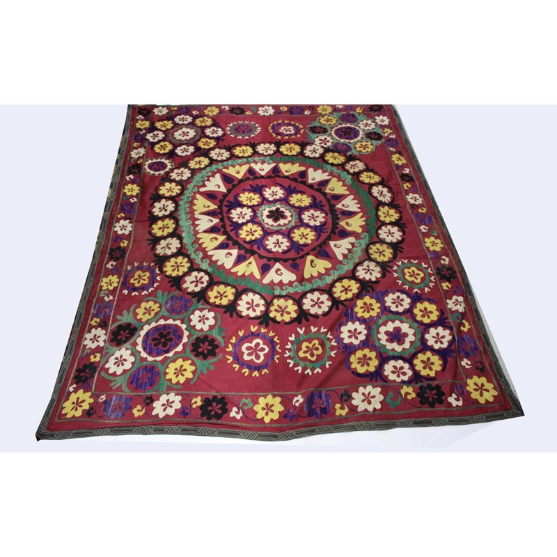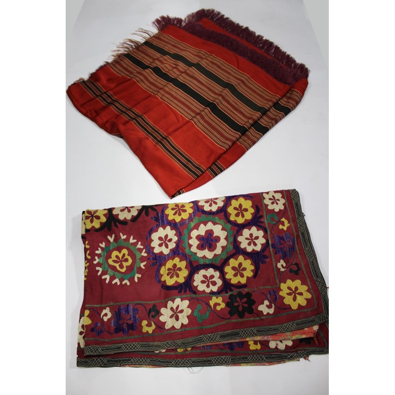 MIDDLE EASTERN SUSANI & SYRIAN SHAWL a Middle Eastern susani, cotton with silk embroidery (188cms by 146cms), also with a striped silk Syrian shawl. Both early 20thc. (2)