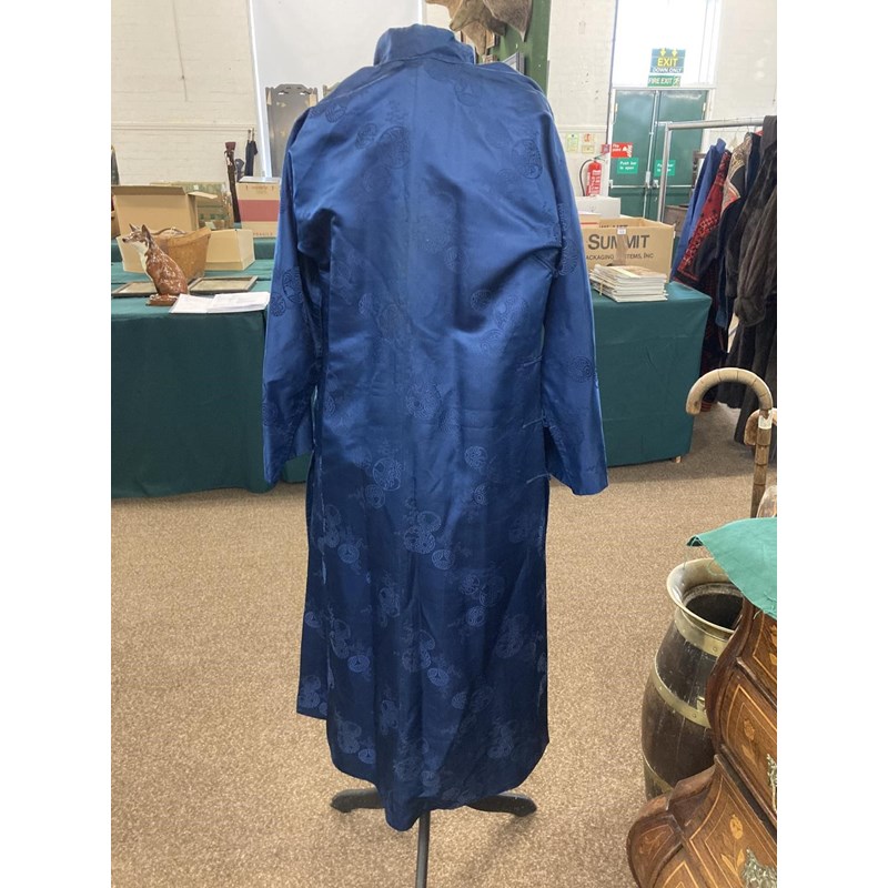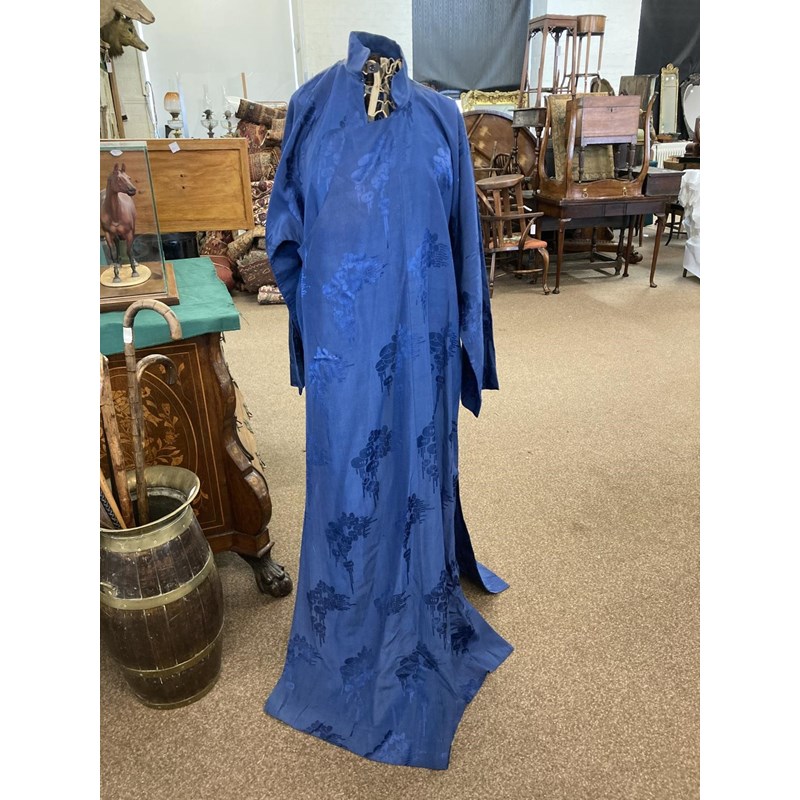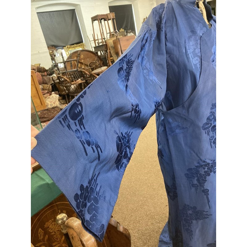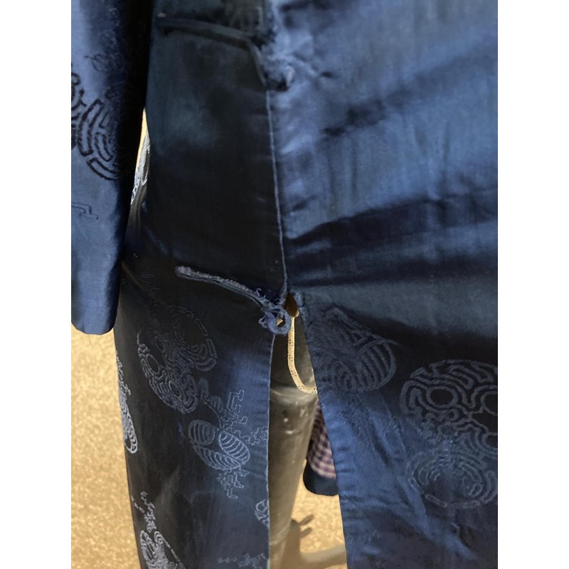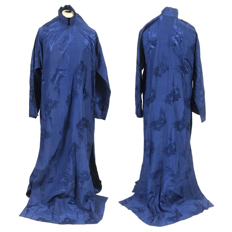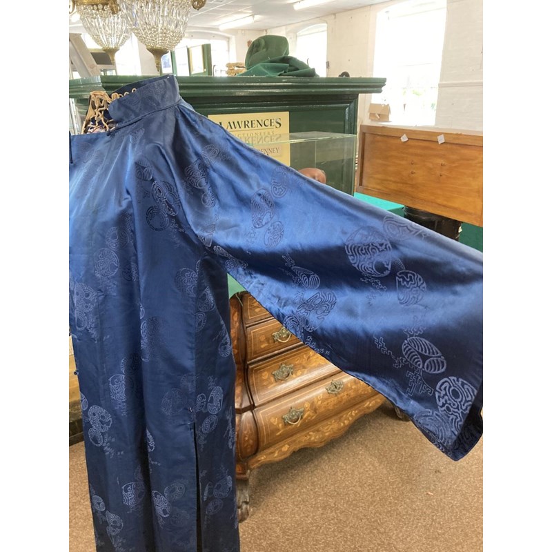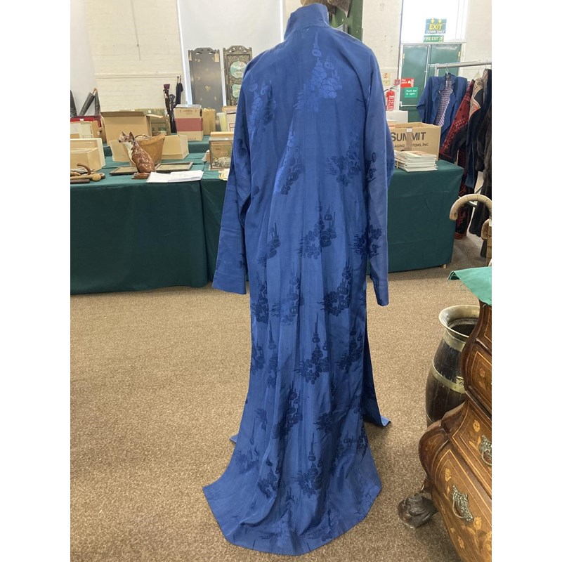 two Chinese blue silk damask mandarin robes, one late 19thc lined with checked silk (126cms high), the other circa 1900 (156cms high). (2)