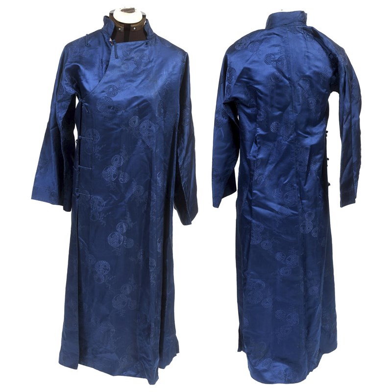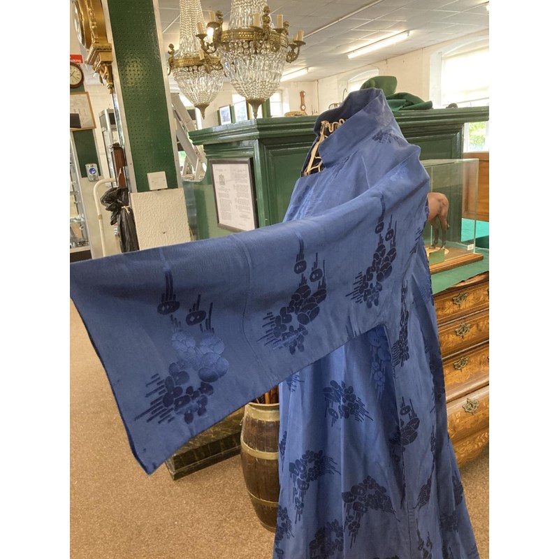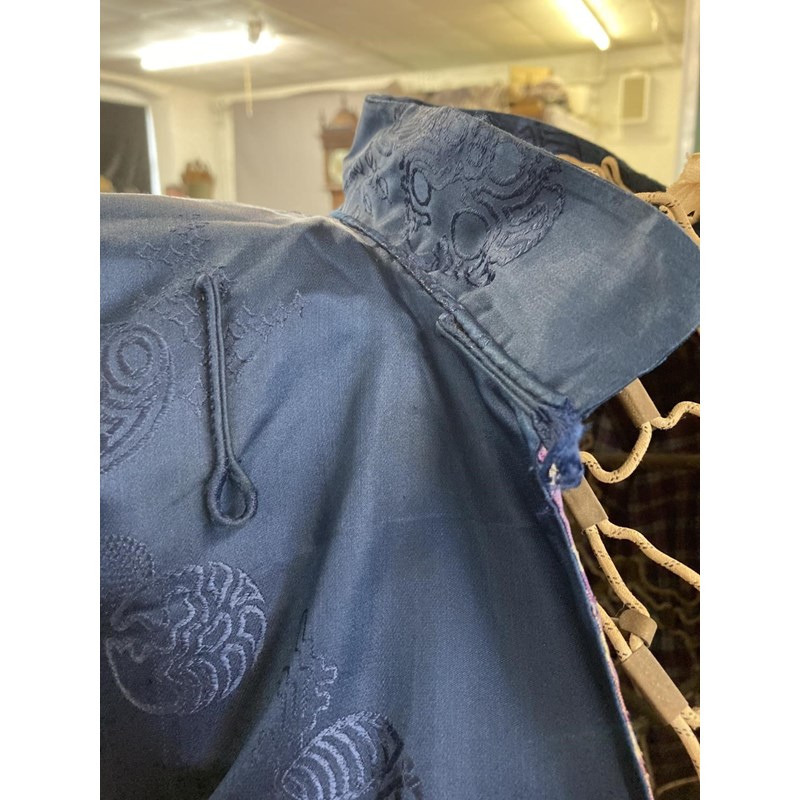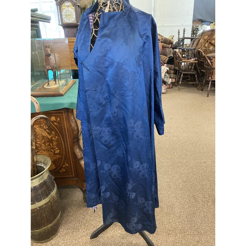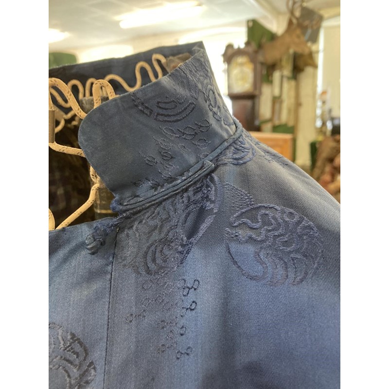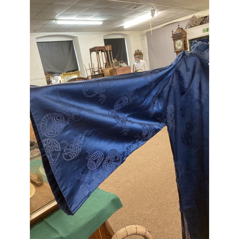 two Chinese blue silk damask mandarin robes, one late 19thc lined with checked silk (126cms high), the other circa 1900 (156cms high). (2)