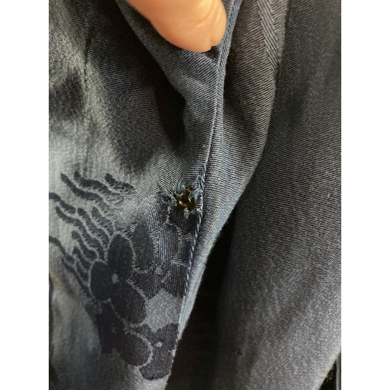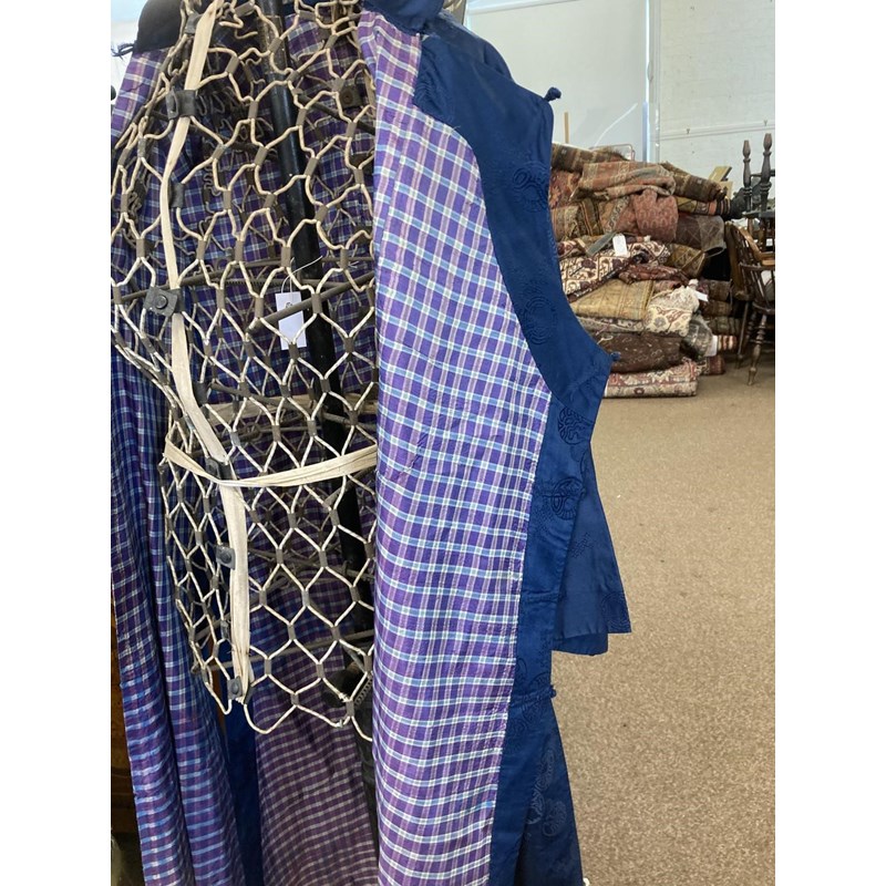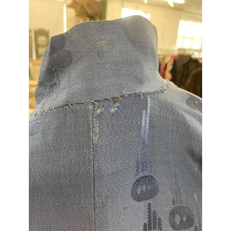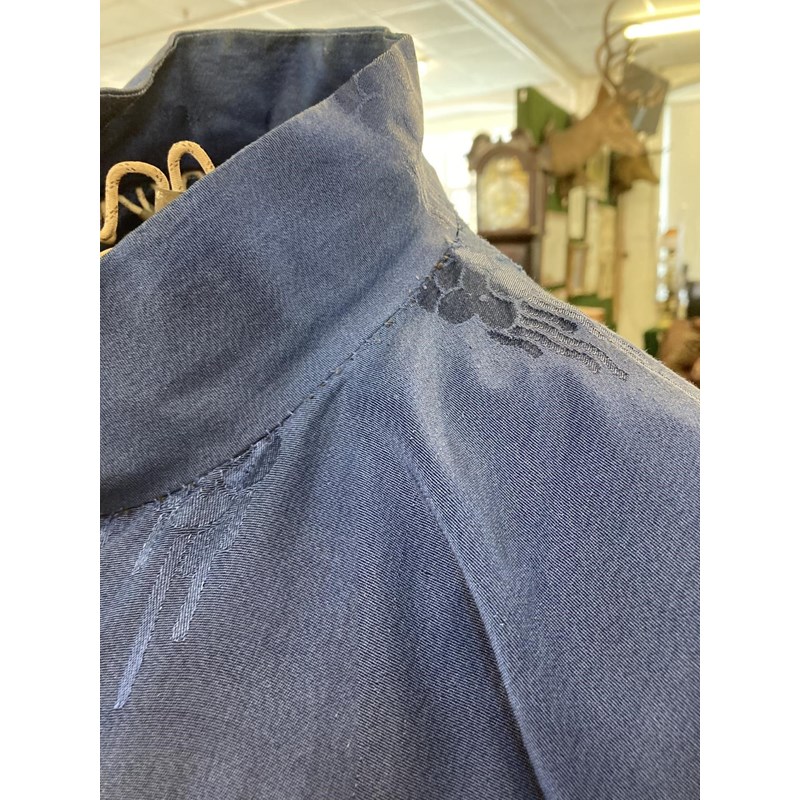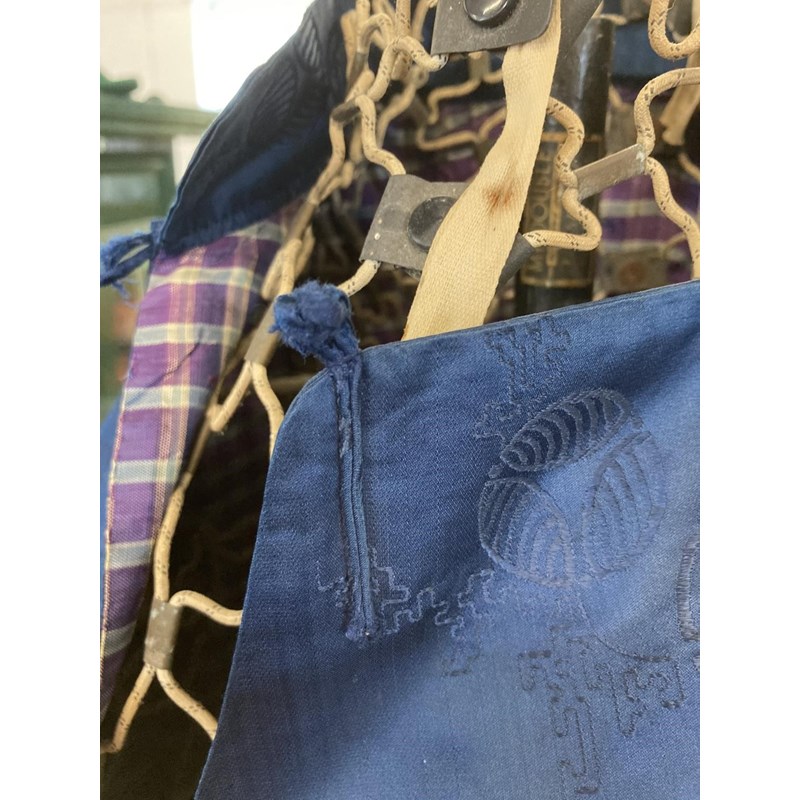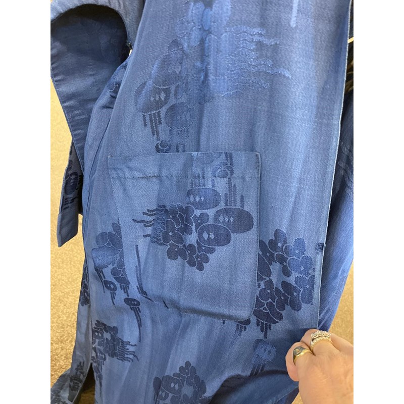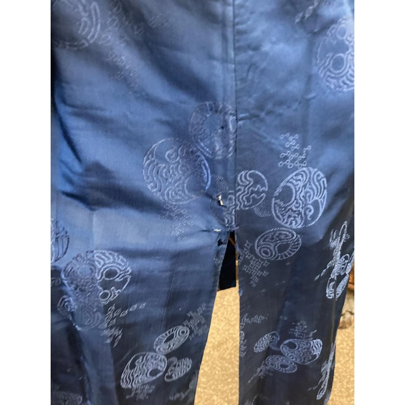 two Chinese blue silk damask mandarin robes, one late 19thc lined with checked silk (126cms high), the other circa 1900 (156cms high). (2)