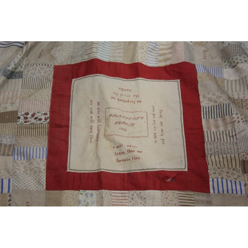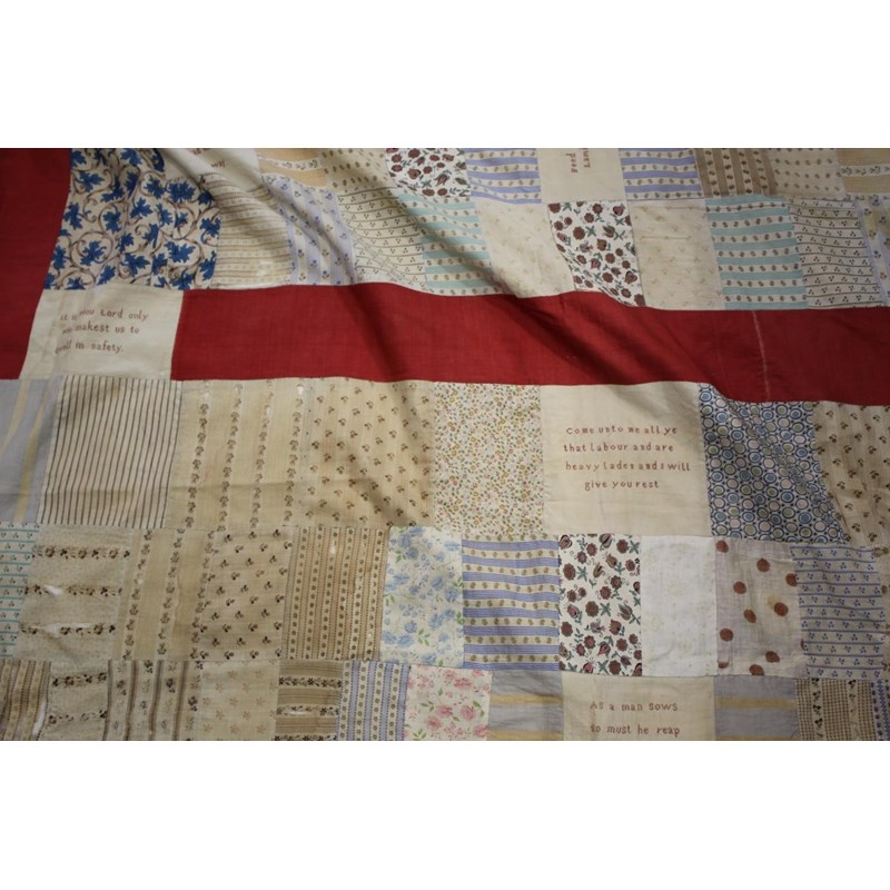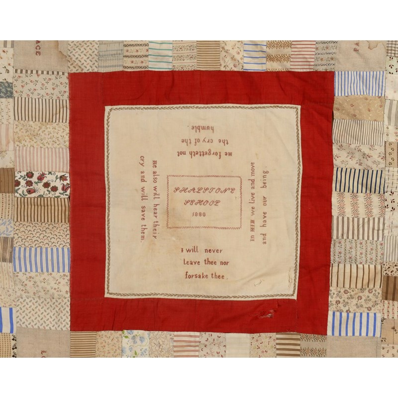 a 19thc patchwork quilt cover (with some later patched repairs), dated 1880 in a central square and with smaller squares of embroidered religious verses. Marked in the centre, Shalstone School, 1880. Size 2m 30cms by 2m 50cms