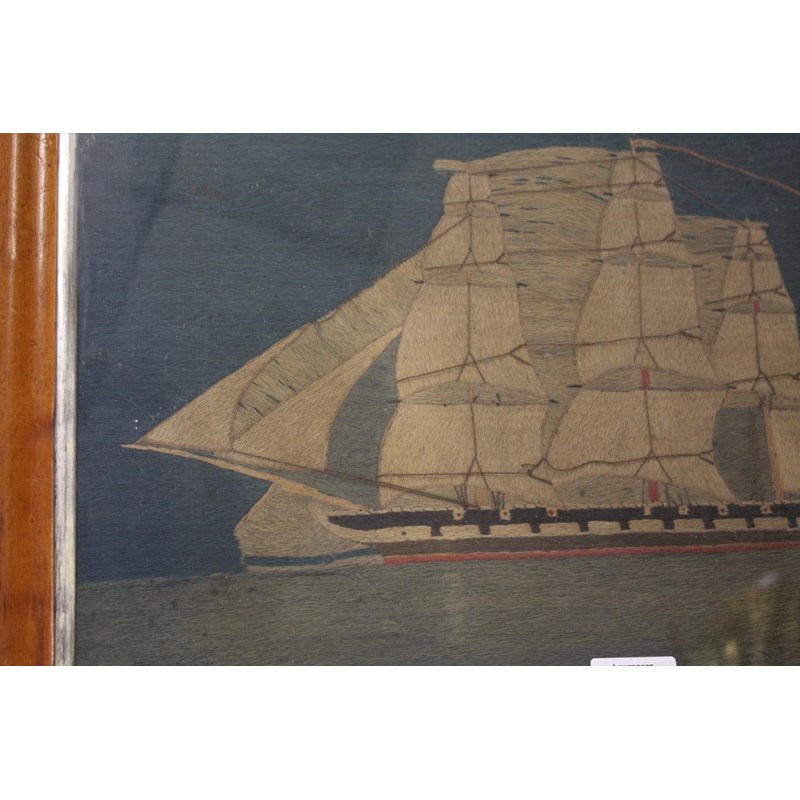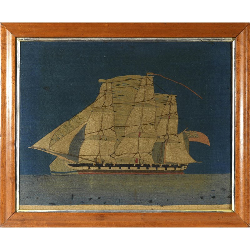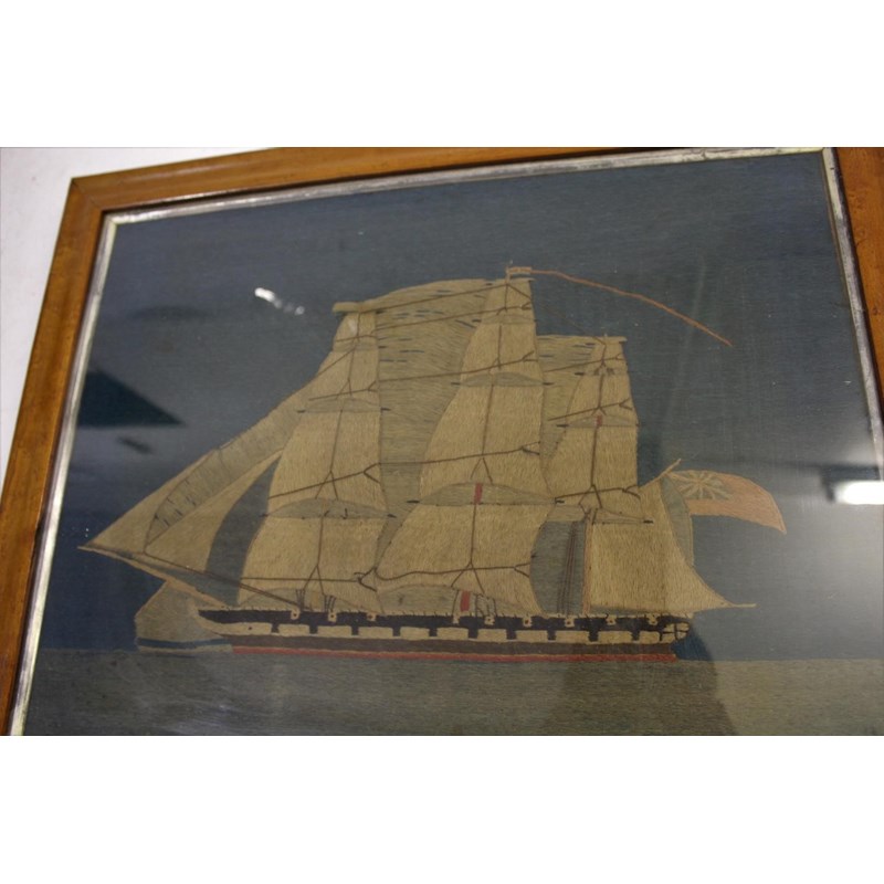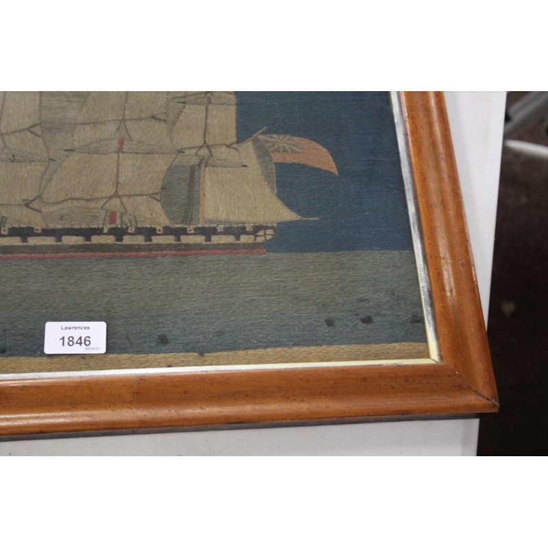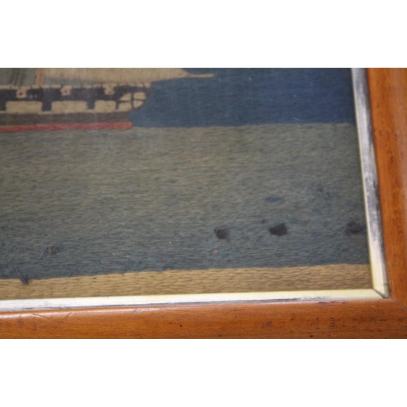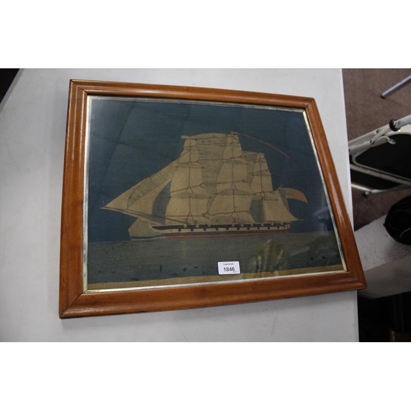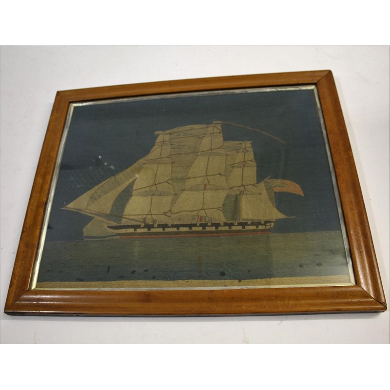 a large woolwork of a masted ship with a red ensign flag at the stern, and with a smaller pennant at the top of the mast. Mounted in a maple frame. 46cms by 37cms, Frame 55cms by 45cms