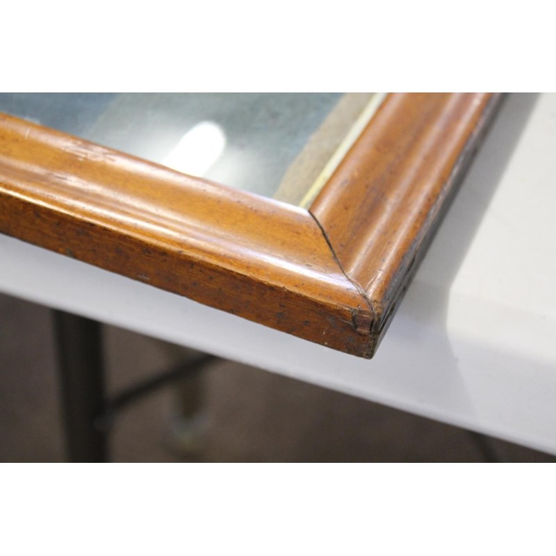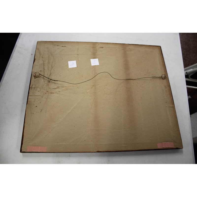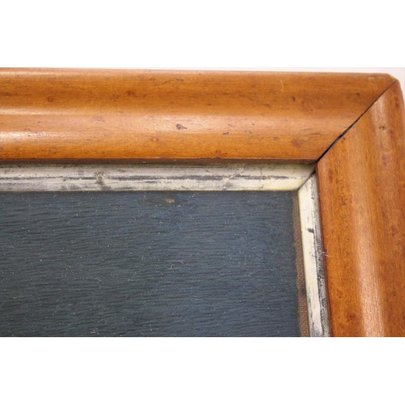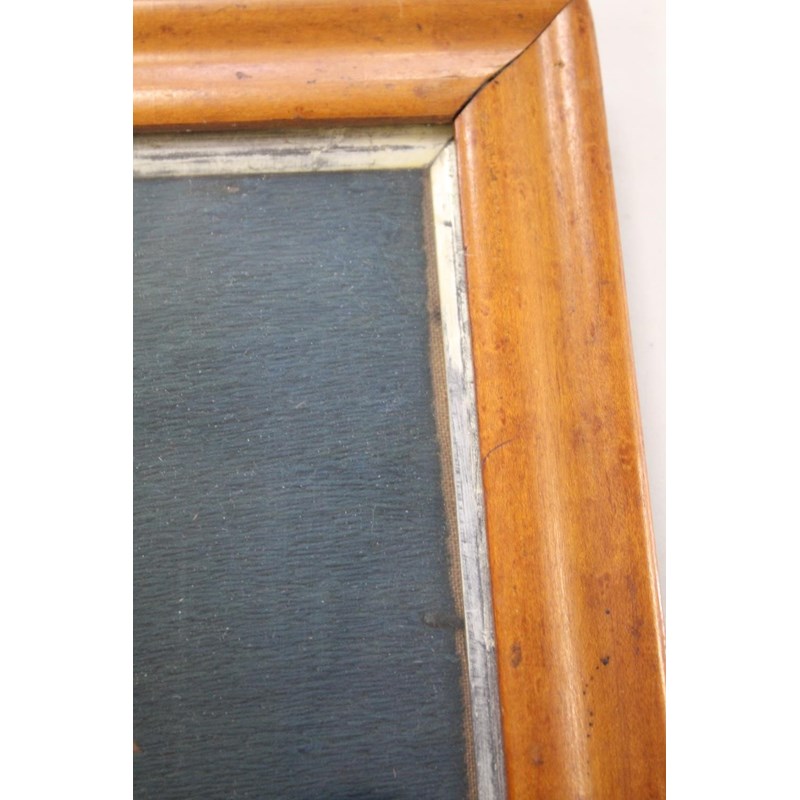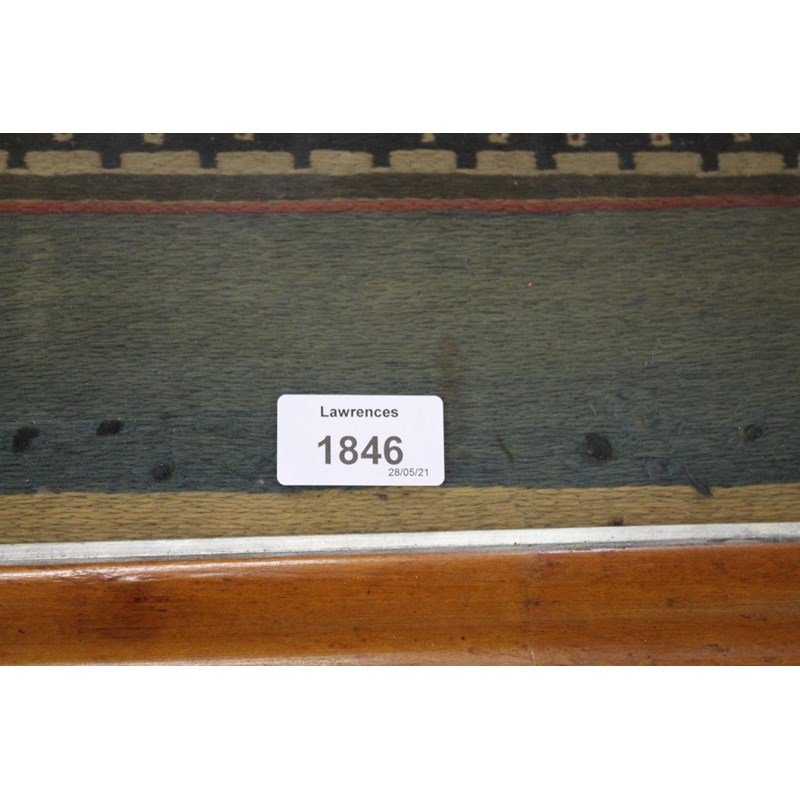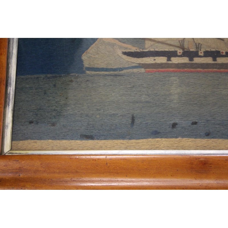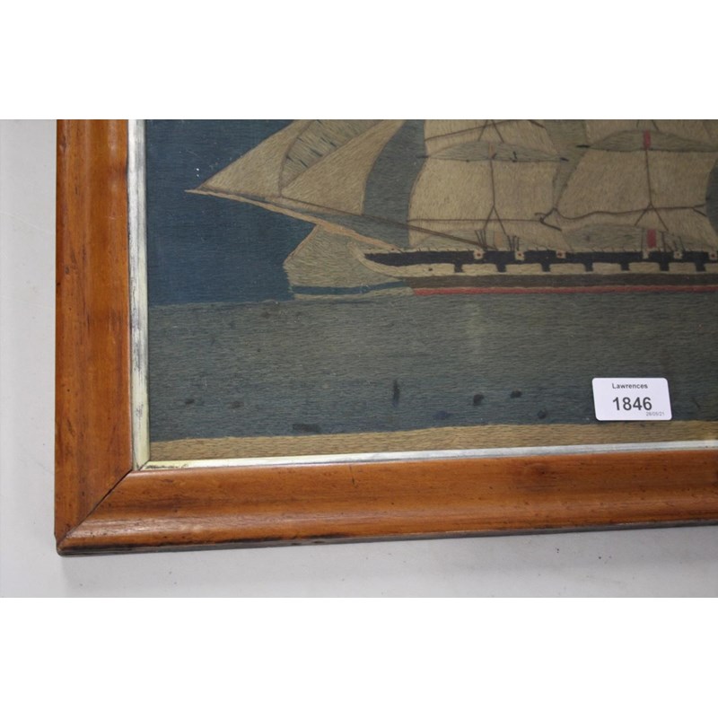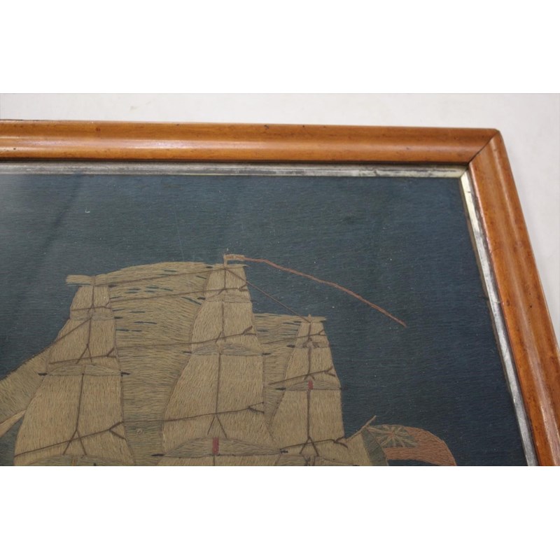 a large woolwork of a masted ship with a red ensign flag at the stern, and with a smaller pennant at the top of the mast. Mounted in a maple frame. 46cms by 37cms, Frame 55cms by 45cms