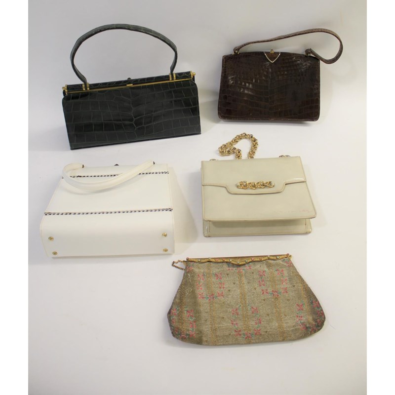 including a dark green 1960's crocodile handbag, a dark brown 1960's crocodile handbag, Rayne of London cream patent leather handbag with heavy gold coloured chain handle, a metallic bead evening bag, and a Rayne of London white leather bag with black and white detail. (5)