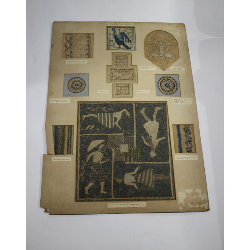 an interesting display board showing samples of lace and crochet work, with typed labels next to each piece. Including Pillow Laces, Needlepoint, Carrickmacross, Chalice Veil for St Michael's Church, Limerick Panel, Bobbin Lace etc. Board 60cms by 82cms
