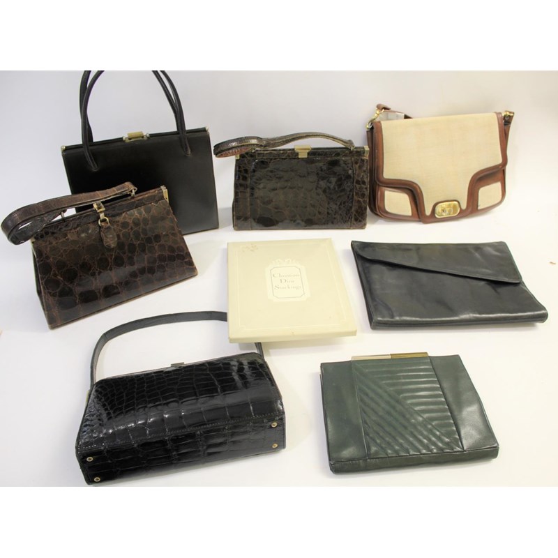 a mixed lot including two pairs of Christian Dior stockings in original box (one pair unworn), a dark green leather clutch bag with deco clasp, a British made 1930's leather clutch bag, three reptile skin bags, and 2 further handbags.