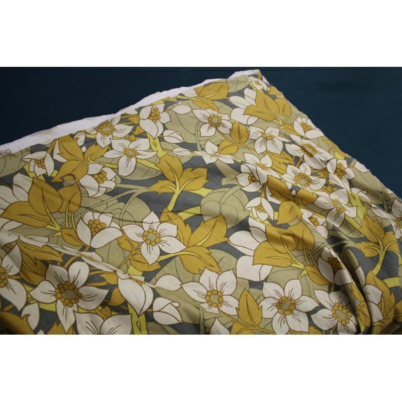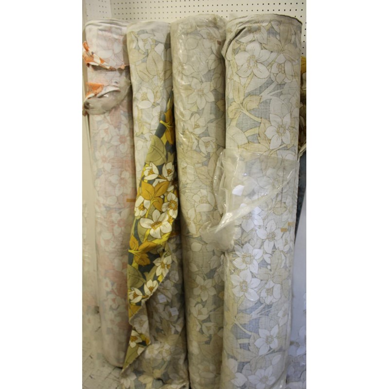 4 large rolls of vintage floral pattern cotton material, suitable for light upholstery or similar projects. Three rolls in gold/green material, and one in pink/orange. Width 140cms. (4)