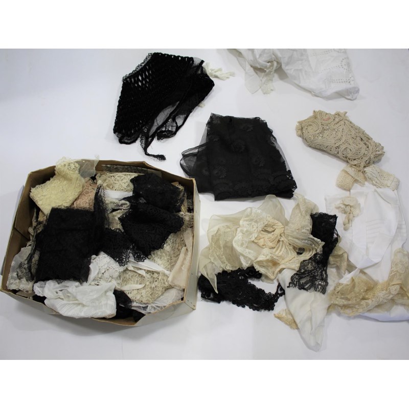VINTAGE LACE a collection of late 19thc and early 20thc lace off cuts, edgings, collars, caps, and two white pinnafore aprons.